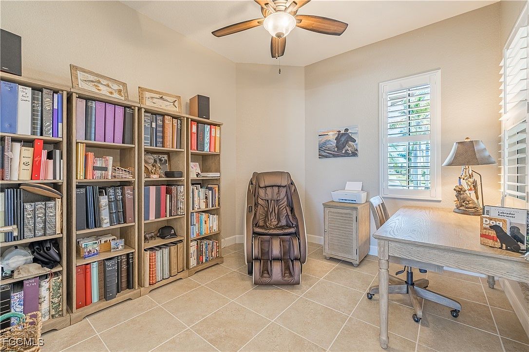 This cozy home office features a light beige color scheme, enhancing its inviting feel. A wooden bookshelf occupies one wall, filled with books and binders organized by color, showcasing a personal touch. Near the center, a plush recliner offers relaxation and comfort. A simple wooden desk with a rolling chair provides a workspace, while a lamp adds a warm glow. Natural light streams through the plantation shutters on the window, brightening the room. An artwork piece depicting a serene fishing scene enhances the decor, creating a harmonious blend of functionality and aesthetic appeal.
