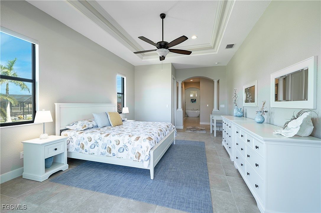 The spacious bedroom features a calming palette of soft greens and whites, enhancing the airy feel. A white bed with a floral-patterned duvet is centered against a wall, complemented by a light blue throw pillow. Flanking the bed, elegant nightstands with lamps create symmetry. A large area rug in subdued blue adds texture, grounding the space. Natural light floods through two large windows, showcasing palm trees outside, while a stylish ceiling fan circulates air and adds a modern touch. The room transitions into an alcove leading to a luxurious bathroom, with columns framing the passageway, enhancing elegance.
