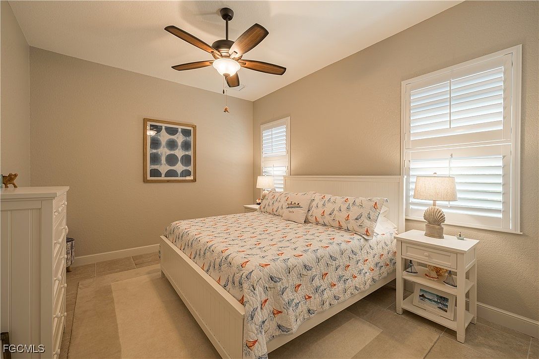 The bedroom features a cozy design with a light color scheme of soft beige walls and warm taupe tiles. A white bed adorned with a patterned quilt showcases sailboat motifs, enhancing a nautical theme. Flanking the bed are two matching white nightstands, each with decorative lamps. A piece of modern art hangs on the wall, providing a focal point with its geometric pattern in deep blue and white tones. Elegant plantation shutters frame the windows, allowing natural light to filter in. A sleek dresser sits to the left, contributing to the room’s functional layout and serene atmosphere.