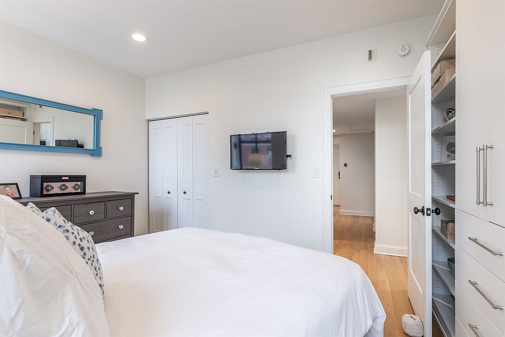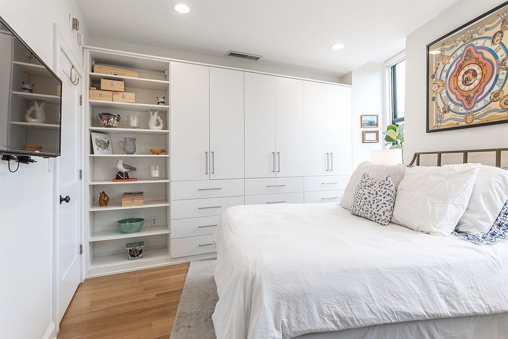 This cozy bedroom features a minimalistic design with a serene color scheme of soft whites and light woods. A plush bed, dressed in crisp white linens, takes center stage, complemented by decorative pillows showcasing subtle patterns. To the left, a dark wood dresser adds contrast and practicality, while a blue-framed mirror enhances the bright ambiance. A wall-mounted television is positioned for convenience, maximizing space. Closets with double doors offer organized storage, and a built-in shelf subtly displays curated items. The hardwood floor provides warmth, and modern lighting fixtures emphasize the clean lines and contemporary aesthetics of the space.