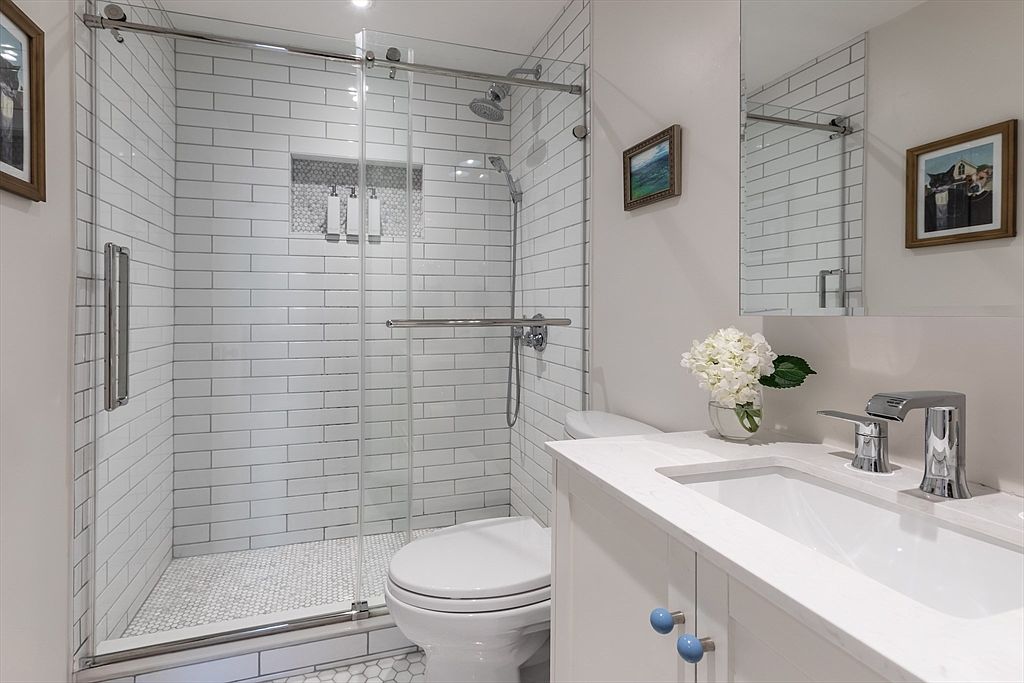 This bathroom features a sleek design, characterized by white subway tiles lining the shower walls and a matching mosaic floor. A glass shower enclosure enhances the sense of space, allowing light to flow through. The modern fixtures, including a polished chrome faucet and showerhead, add a contemporary touch. A double sink vanity in white has subtle blue knobs, complementing the calming aesthetic. A minimalist mirror reflects the room’s brightness, while framed artwork above the toilet introduces a personal touch. A small vase with white flowers adds a hint of freshness, creating a serene and inviting atmosphere.