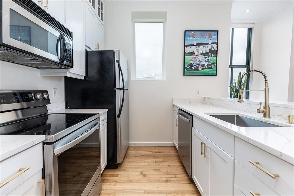 This kitchen features a modern layout with sleek white cabinetry, offering a clean and contemporary aesthetic. A shiny stainless steel stove and microwave complement a matte black refrigerator, creating a striking contrast. The countertop boasts a white surface with subtle veining, paired with a deep sink and a stylish gold-finished faucet, enhancing the upscale feel. Natural light streams in through a nearby window, illuminating the warm wooden flooring. A vibrant poster hangs on the wall, adding a personal touch, while the overall design maintains a harmonious balance between functionality and modern elegance.