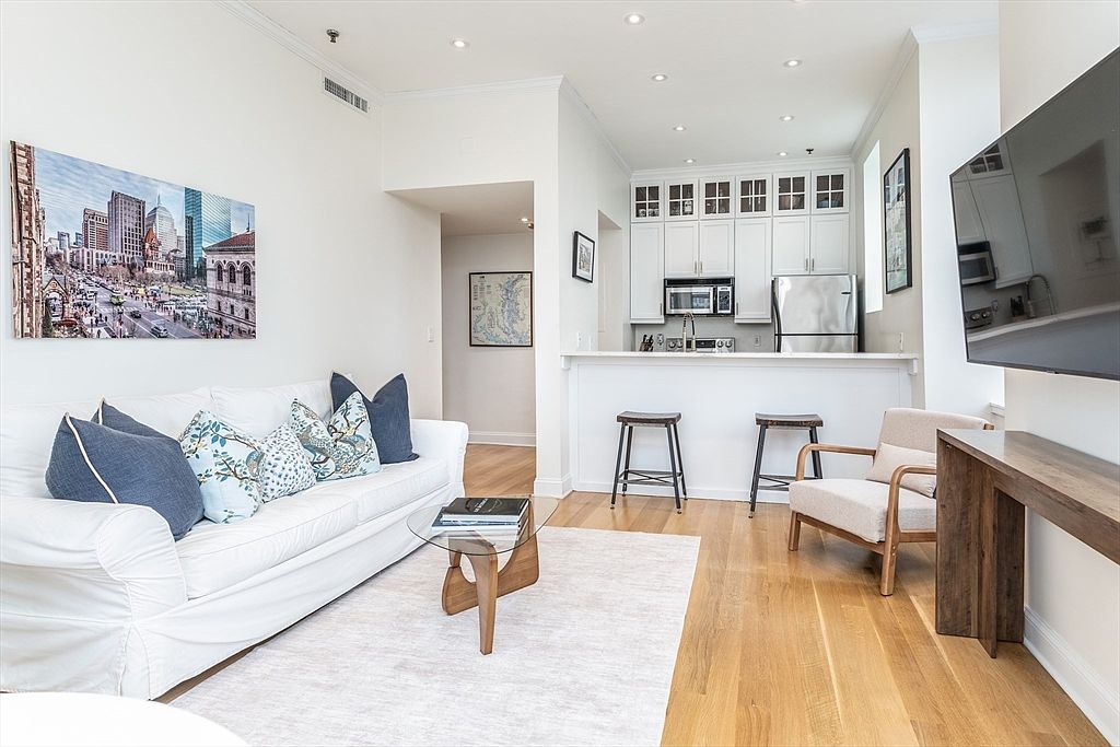 Located in the vibrant South End of Boston, this newly updated 5th-floor corner condo blends historic charm with modern amenities. Built during the late 19th century, the building showcases classic Victorian architecture, accentuated by detailed moldings and expansive windows that offer breathtaking Back Bay views. Recently renovated, the unit features an upgraded HVAC system, hardwood floors, and a newly designed bathroom, making it move-in ready. Priced at $1,275,000, this two-bedroom, one-bathroom home boasts ample storage and high ceilings across its spacious layout. The property also includes access to a communal roof deck, enhancing the appeal of urban living in a sought-after locale, with a plot area that complements its total square footage.