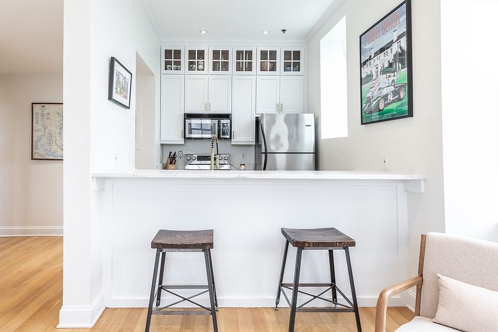 The kitchen bar area features a sleek white countertop that extends, offering a casual seating space with two dark wood stools. The cabinetry above is crafted in a bright white finish, accented by glass-paneled doors, revealing neatly organized items. Stainless steel appliances, including a refrigerator and oven, complement the space, blending modern functionality with the airy aesthetic. Natural light pours through a window, enhancing the open feel, while artwork on the walls adds character. The warm wood flooring adds contrast and warmth, contributing to the inviting atmosphere of this multifunctional culinary hub.