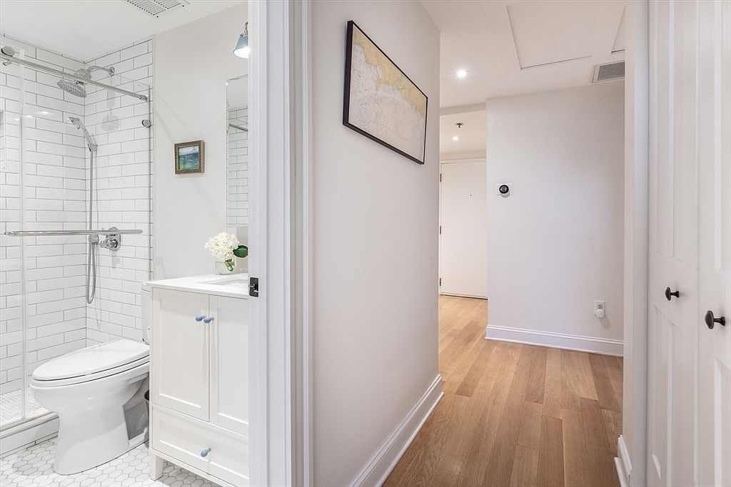 A modern bathroom entryway features a sleek, glass-enclosed shower with white subway tiles, creating a bright and airy feel. The light-colored cabinetry below the sink, highlighted by blue knobs, complements the clean aesthetic. A small vase with white flowers adds a touch of elegance to the countertop. A mirror reflects the natural light from recessed ceiling fixtures, enhancing the spacious atmosphere. The walls are painted a soft white, contributing to a serene environment. Adjacent to the bathroom, a narrow hallway extends, showcasing light hardwood floors and minimalistic doors, emphasizing the seamless flow of the home.