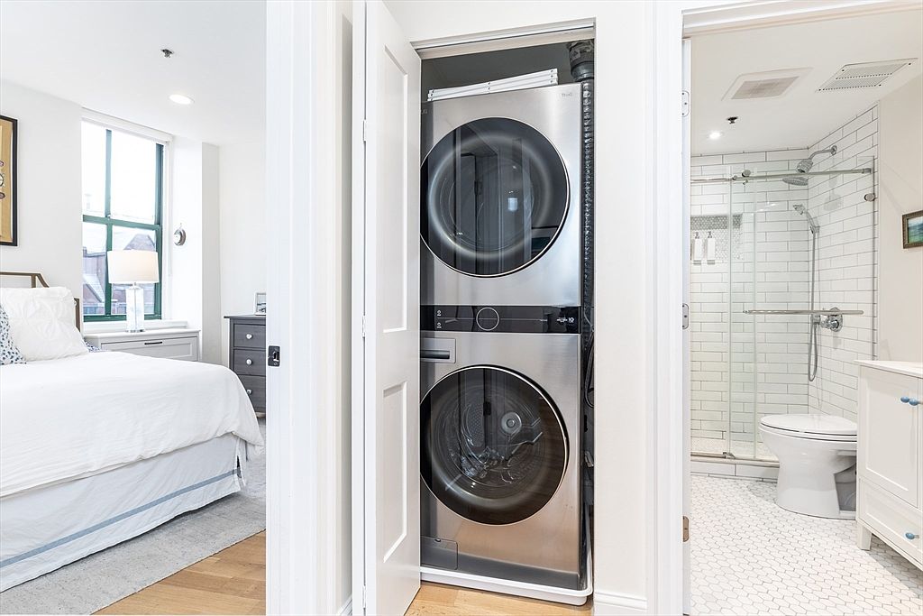 A compact laundry nook is seamlessly integrated into the design of a bedroom suite. To the right, modern stacked stainless steel washer and dryer units are tucked neatly within a closet space, emphasizing efficiency in a small area. The bedroom features light-colored walls that create an airy ambiance, with a cozy bed dressed in white linens positioned near a large window, allowing natural light to flood in. A soft gray area rug adds warmth underfoot, while a sleek side table with simple decor enhances the overall minimalist aesthetic. Adjacent, a spacious bathroom showcases white subway tiles and a contemporary glass shower.