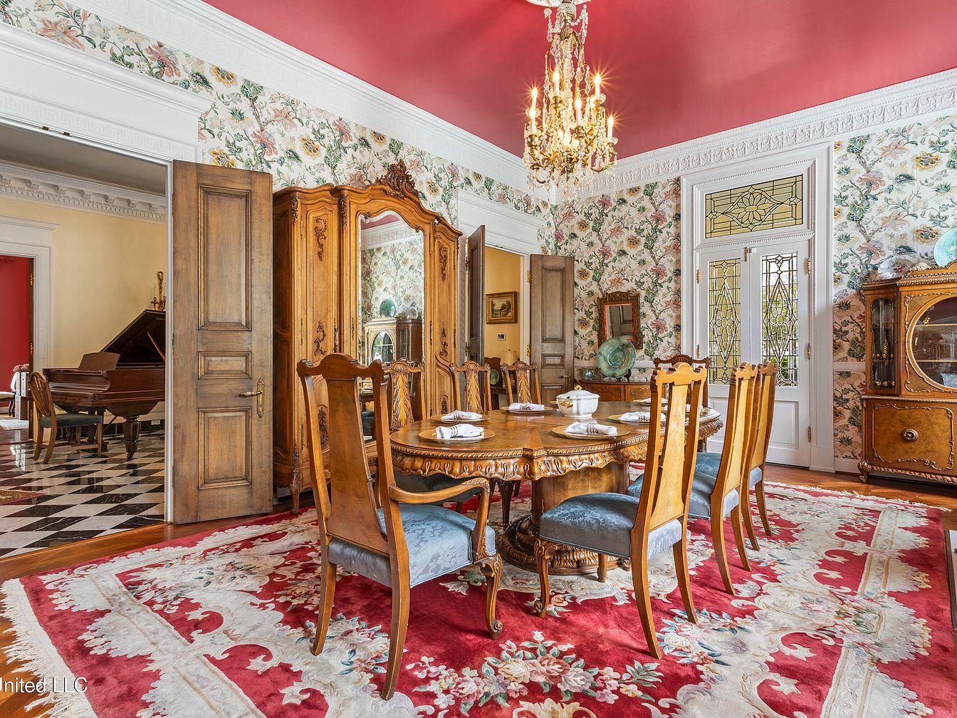 A grand dining room featuring a round wooden table surrounded by intricately designed chairs with plush blue upholstery. The warm red and cream color scheme is accentuated by a bold red ceiling and floral wallpaper that adds a classic touch. A lavish chandelier hangs above the table, casting a soft glow across the space. Rich wooden cabinets and mirrored furniture flanks the room, highlighting exquisite detailing. A lush area rug with an ornate floral pattern contrasts beautifully against the polished hardwood floor, while a door with stained glass offers glimpses of an adjoining room, enhancing the overall elegance.