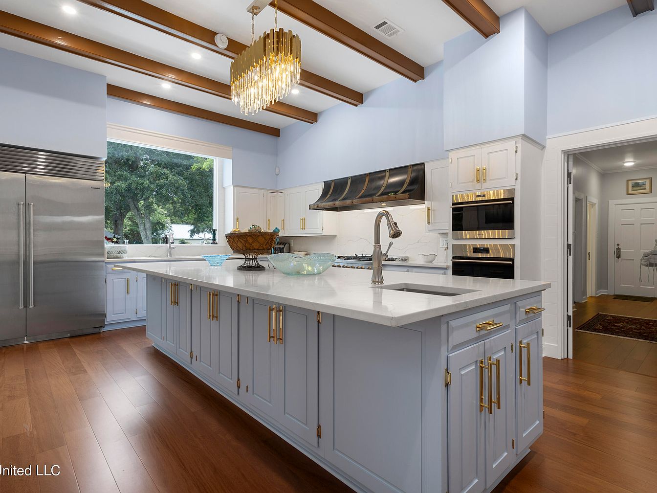 This kitchen features a spacious island with a smooth, white countertop that contrasts beautifully against the soft blue cabinetry. Gleaming gold hardware adds a touch of elegance to the drawers and cabinets. The kitchen is illuminated by a stunning chandelier, its cascading design enhancing the visual height of the beamed ceiling. Natural light spills in through large windows, connecting the interior to the lush outdoor scenery. Stainless steel appliances, including a refrigerator and a range hood, blend seamlessly into the design, while wood flooring complements the modern yet classic aesthetic, fostering a warm and inviting atmosphere.