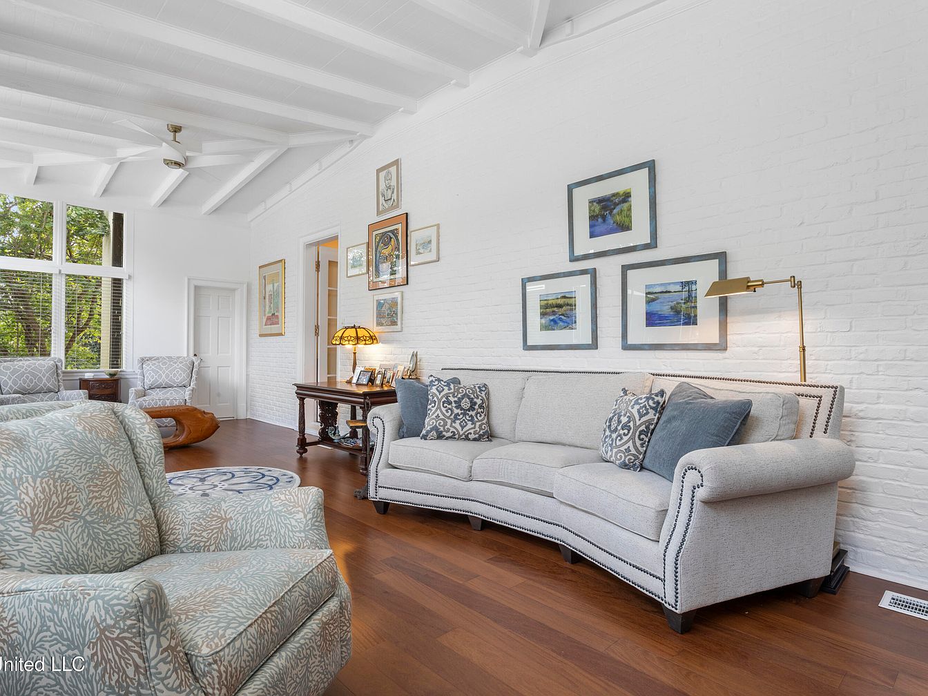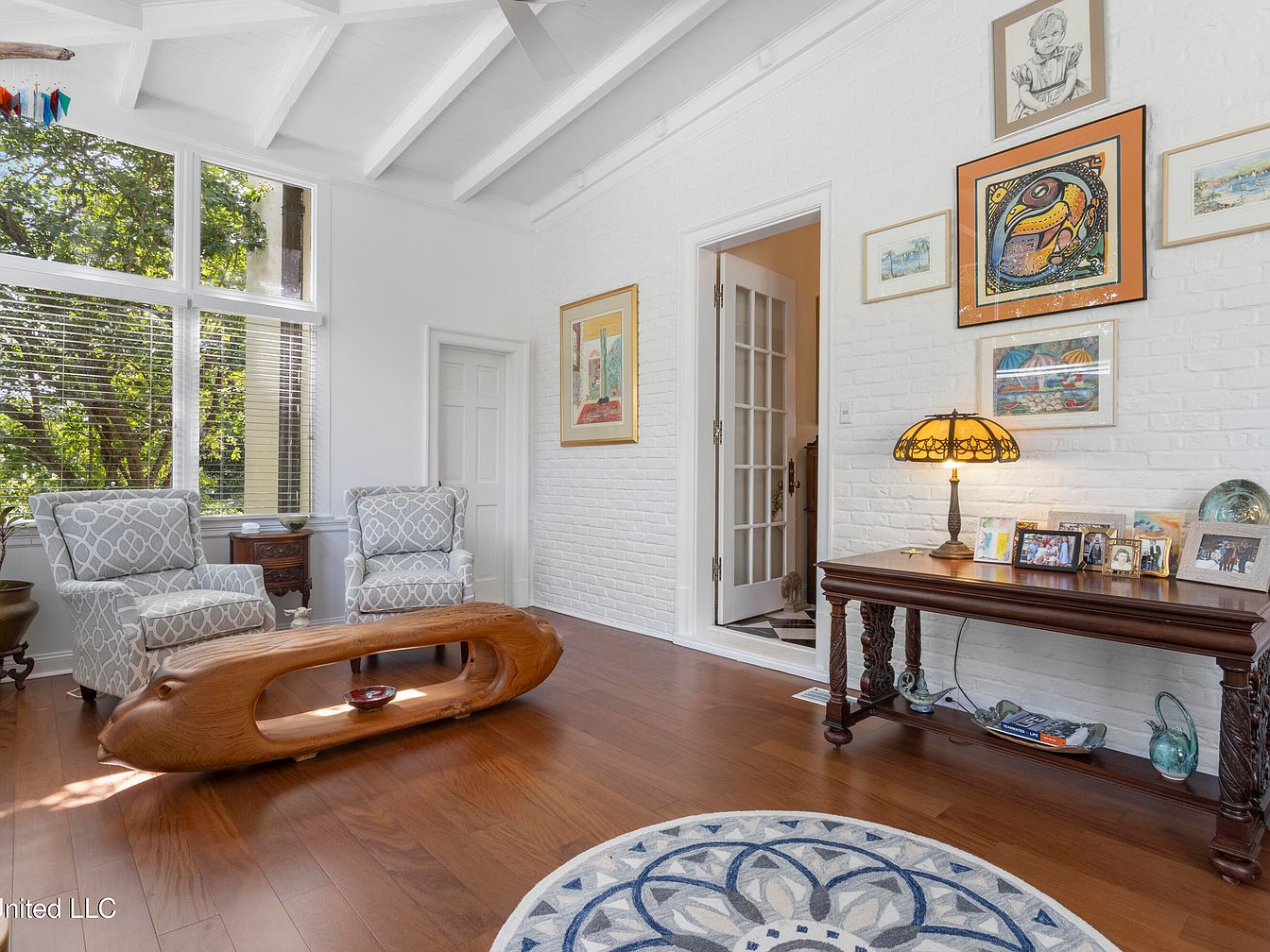 This living room features a bright, airy layout with high, white-beamed ceilings enhancing its spaciousness. The walls are adorned with a textured white brick, providing a rustic charm. Two patterned armchairs in soft grey offer comfortable seating, framed by large windows that invite natural light and views of lush greenery. A unique wooden coffee table with organic curves serves as a focal point. A richly stained side table holds framed photographs and a decorative lamp casting a warm glow. Artwork in vibrant colors hangs above, contributing to a balanced aesthetic that combines elegance with a touch of whimsy.