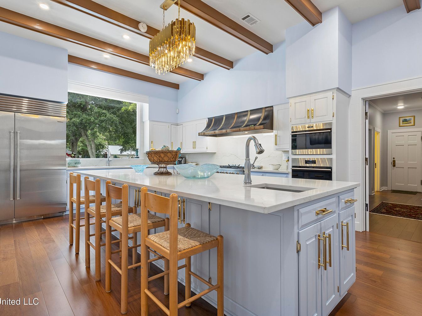 This modern kitchen features an island with a sleek white countertop and six wooden chairs with woven seats, inviting casual dining. Light blue walls complement the warm tones of the exposed wooden beams above, creating an airy atmosphere. A large window illuminates the space, offering views of greenery outside. The cabinetry is detailed with brass hardware, enhancing the sophisticated design. Stainless steel appliances, including a tall fridge and modern ovens, provide functionality. An elegant chandelier adds a touch of glamour, while the hardwood flooring creates warmth, merging style with practicality for a vibrant cooking environment.