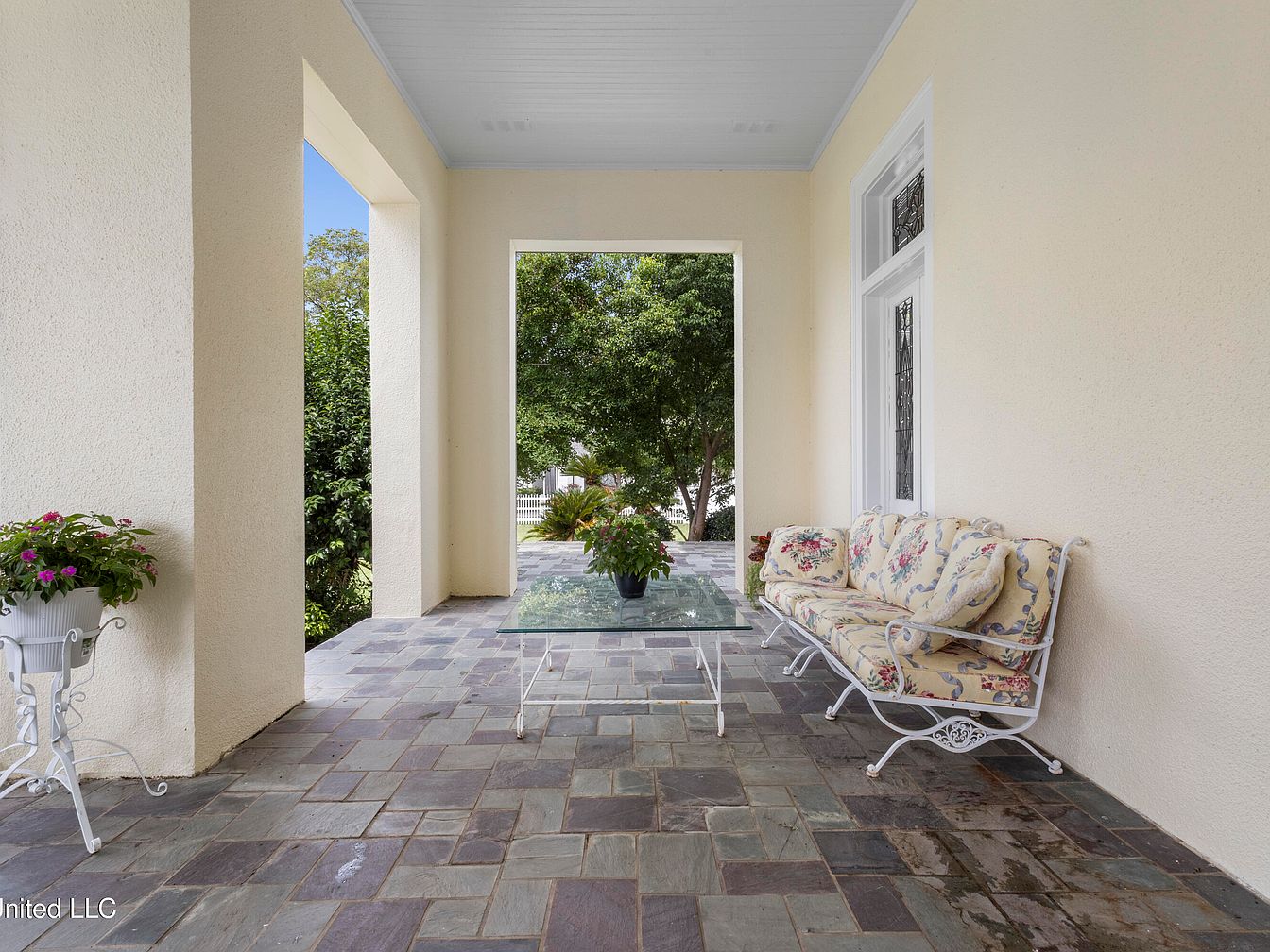The front porch features a spacious and inviting layout, surrounded by large open doorways that frame the view of lush greenery outside. The color scheme is soft and warm, with light beige walls complementing the cool tones of the slate stone flooring. A comfortable floral-patterned sofa with soft cushions provides seating, paired with a glass-top coffee table that adds an airy feel. Potted plants in white ceramic containers enhance the decor, creating a serene atmosphere. The natural light floods the space, highlighting the architectural details, including elegant door frames and a gently sloped ceiling.