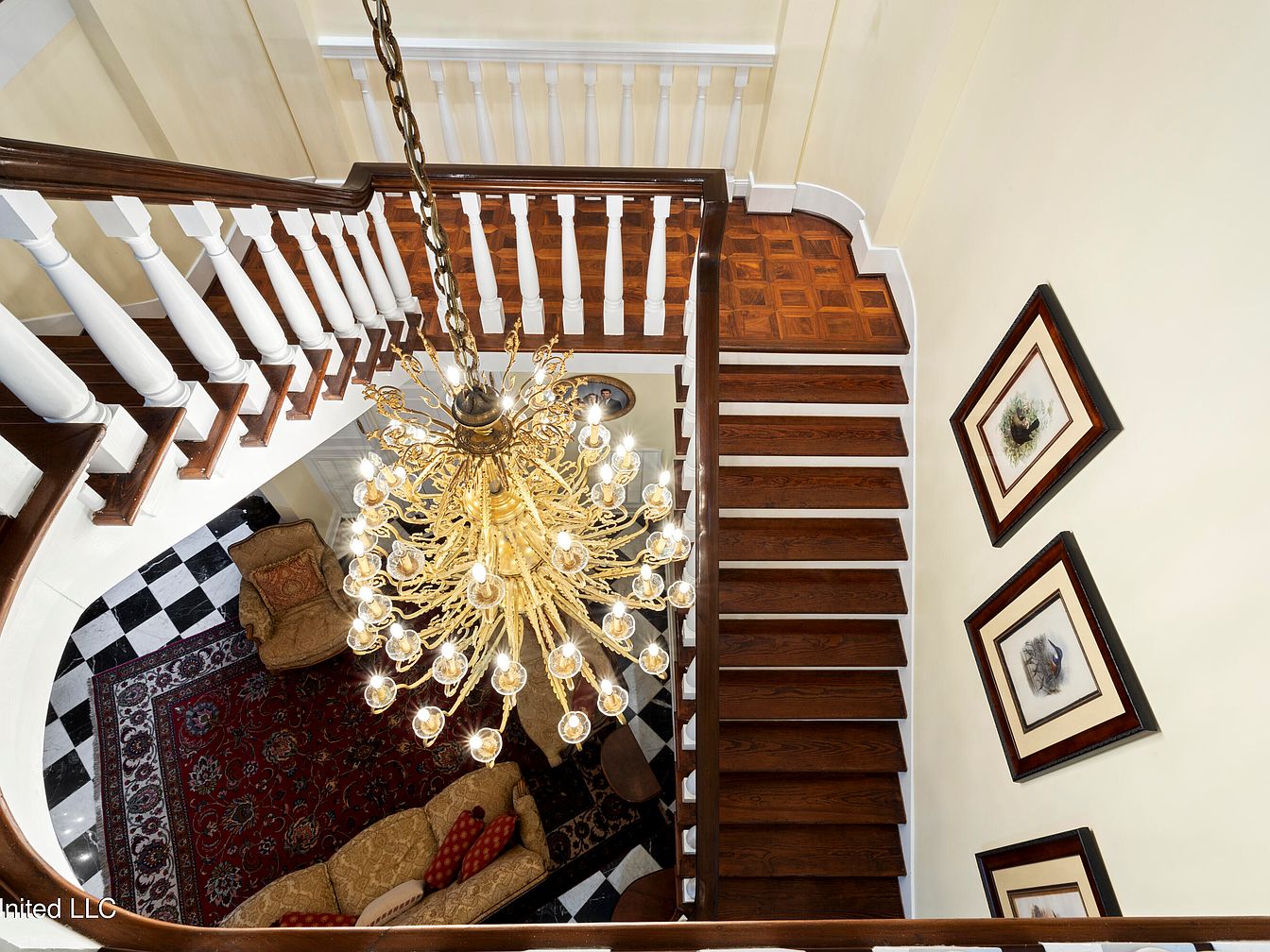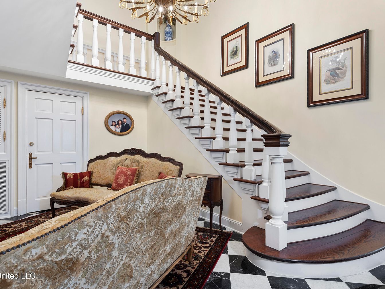 The staircase showcases an elegant layout, blending traditional and contemporary elements. Dark hardwood steps create a warm contrast against creamy walls. A stunning, ornate chandelier hangs gracefully above, illuminating the space with a golden glow. At the base, a classic black-and-white checkered floor leads to a cozy seating area with a plush, patterned rug. An upholstered armchair complements the rich tones of the furnishings, while decorative pillows add a pop of color. Framed artwork adorns the walls, enhancing the sophisticated atmosphere, while the open railing invites a feeling of spaciousness, enhancing the home’s historic charm.