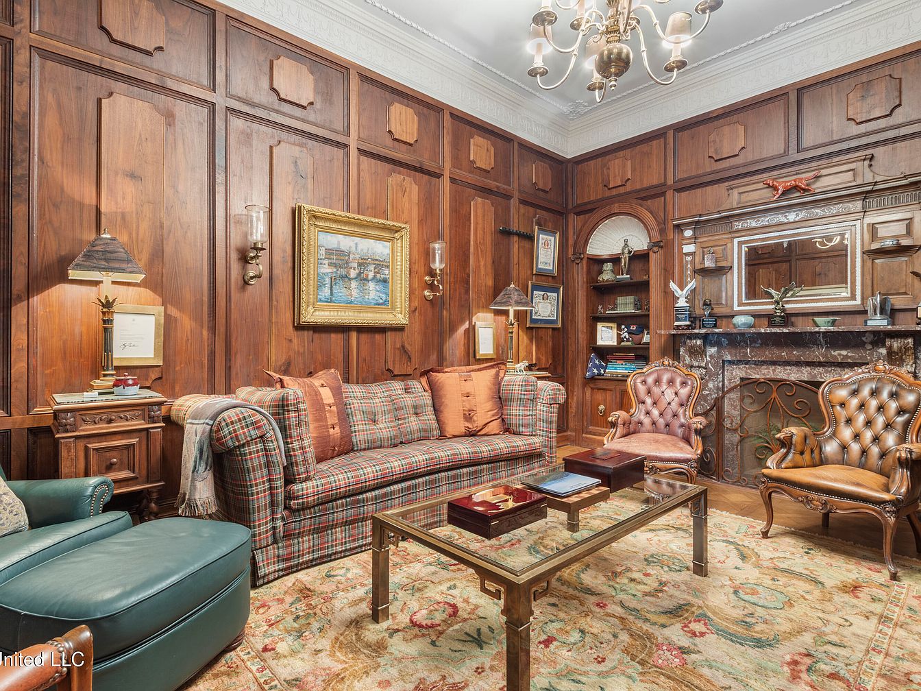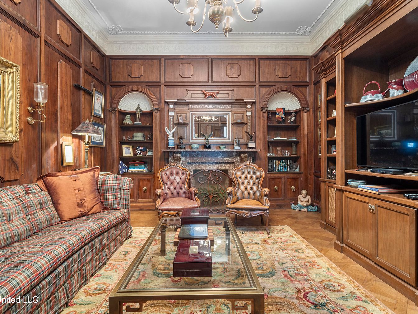 This living room showcases rich, wood-paneled walls that evoke a classic, timeless feel. A plush, plaid sofa with muted colors complements two ornate leather chairs, enhancing the space’s sophistication. A glass coffee table featuring a gold frame sits in the center, reflecting light. Above, an elegant chandelier adds warmth, while wall sconces provide ambient lighting. Notable is the marble fireplace, adorned with intricate ironwork and framed by decorative shelves displaying art and awards, adding character to the space. The overall palette, comprised of earthy tones and deep hues, creates an inviting atmosphere, ideal for relaxation or conversation.