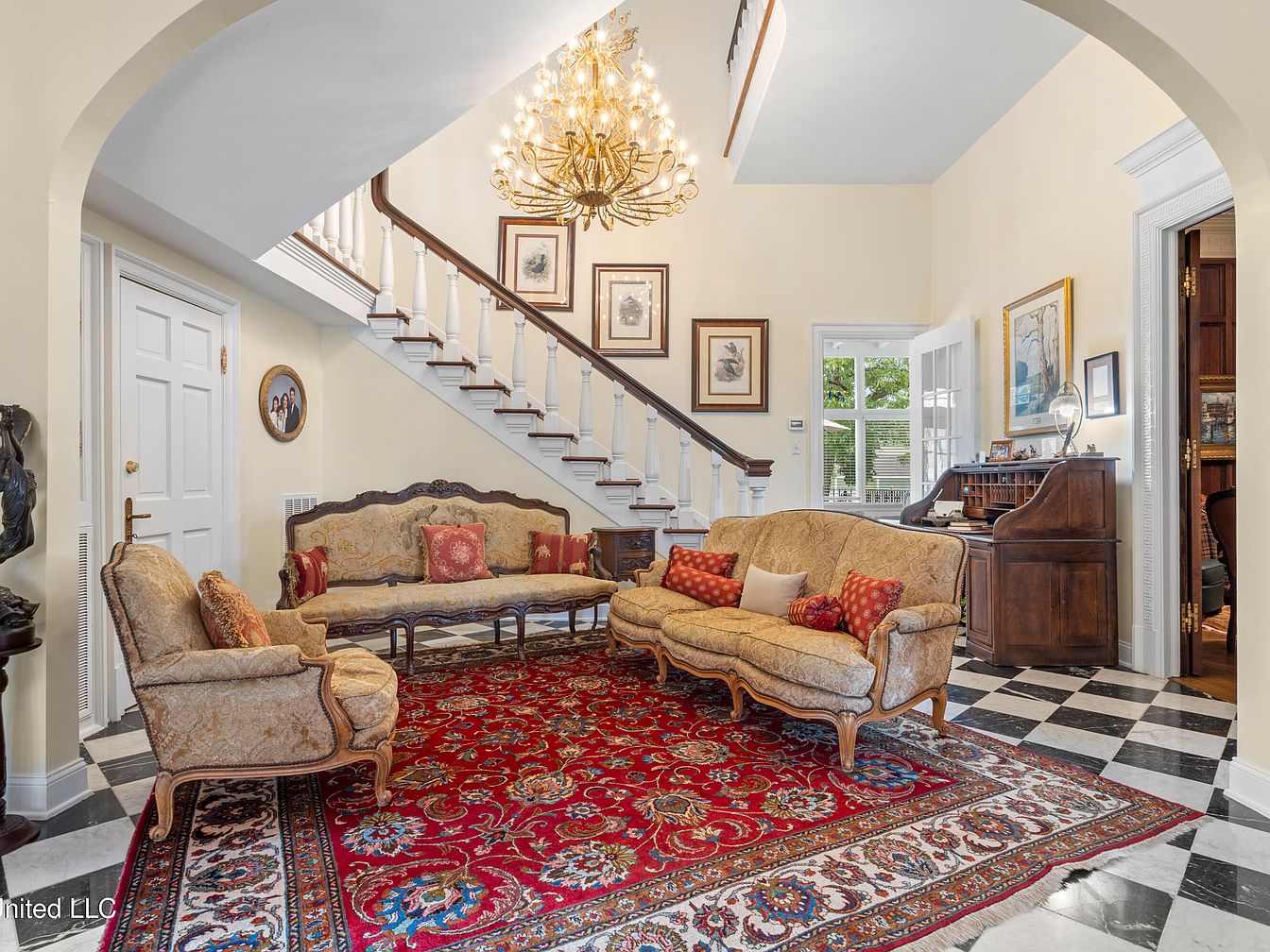 The entryway features a grand staircase with elegant white balusters leading to an upper level. A lavish chandelier illuminates the space, contrasting beautifully against the soft cream walls. The seating area includes ornate furniture with rich upholstery in tones of gold and deep red, complemented by decorative pillows for added comfort. A vibrant red area rug, adorned with intricate patterns, anchors the seating arrangement, enhancing the warmth of the room. Framed artwork adorns the walls, showcasing classic designs, while a stylish writing desk is visible to one side, adding a functional touch to this welcoming space.