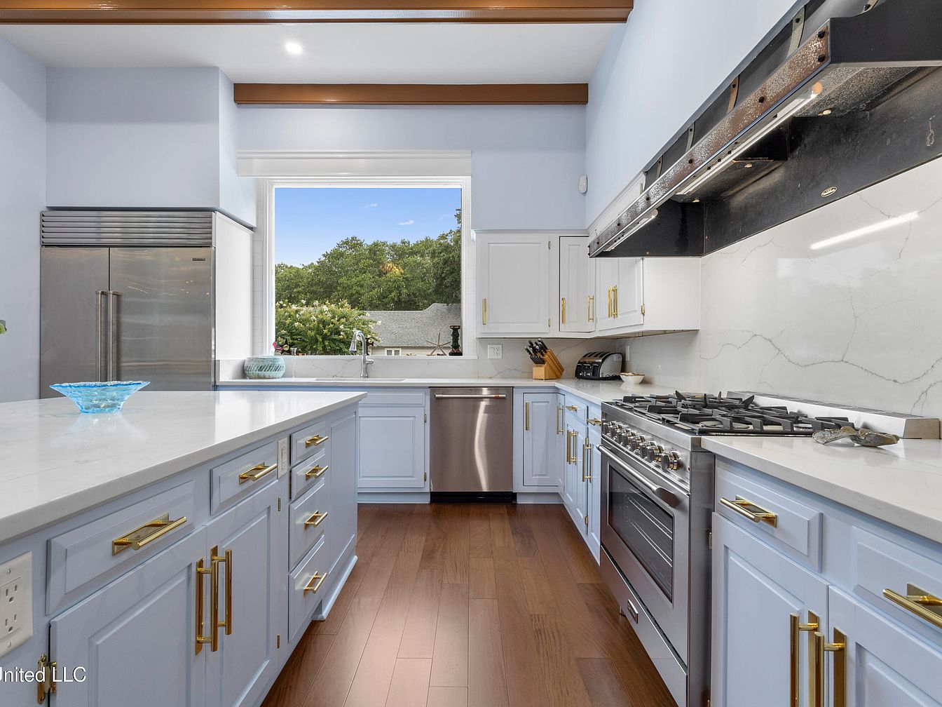 The kitchen showcases a modern design with a clean layout. Light blue cabinetry contrasts beautifully with sleek white marble countertops, adding a fresh, airy feel. Gold handles and knobs accentuate the drawers and cabinets, injecting warmth into the space. A spacious island in the center provides ample preparation area, while stainless steel appliances, including a refrigerator and oven, add a contemporary touch. The large window invites natural light, revealing lush greenery outside. Wooden flooring adds depth and richness, complementing the light color scheme, while exposed wooden beams on the ceiling create an inviting atmosphere.