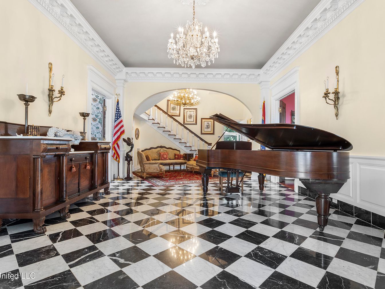 A spacious entryway featuring a stunning black and white checkerboard marble floor that creates a striking visual impact. To the left, a classic wooden sideboard adds warmth, complemented by elegant wall sconces and decorative touches. A grand piano occupies the foreground, showcasing its polished finish. Above, a magnificent crystal chandelier hangs, providing luminous charm. Arched doorways lead to other areas, while an ornate staircase, framed by intricate white moldings, ascends gracefully. The soft yellow walls offer a bright backdrop, with tasteful artwork and furnishings that enhance the historic yet inviting ambiance of this elegant American home.
