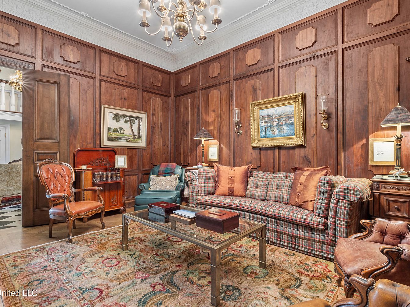 This living room features rich wooden paneling that creates a warm, inviting atmosphere. A plush plaid sofa with accent pillows complements the detailed, antique wooden furniture, including a vintage armchair with intricate carvings. The room is anchored by an ornate area rug, which adds color and texture beneath a glass coffee table. Decorative wall sconces illuminate the space alongside a classic chandelier. A framed painting hangs above a side table, enhancing the overall elegance. The combination of deep hues from the wood and fabric alongside subtle art creates a harmonious, timeless elegance.
