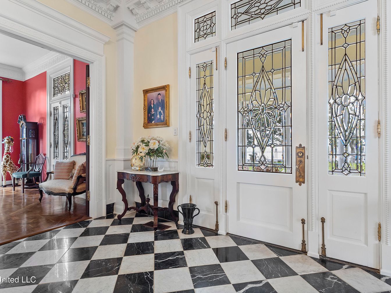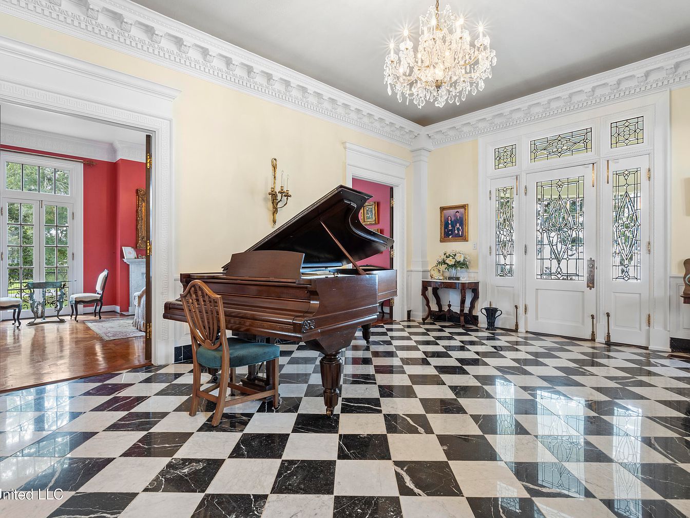 This entryway features a striking black and white checkered marble floor that adds depth and elegance. A grand, polished piano is positioned prominently, complementing the ornate chandelier that casts a warm glow. The walls are a soft buttery yellow, accentuating the intricate crown molding, while a vibrant red wall in an adjacent room creates a bold contrast. Large stained glass doors invite natural light, enhancing the space’s openness. Antique furnishings, including a classic side table and decorative accents, add a historical charm, making this area feel welcoming yet sophisticated.
