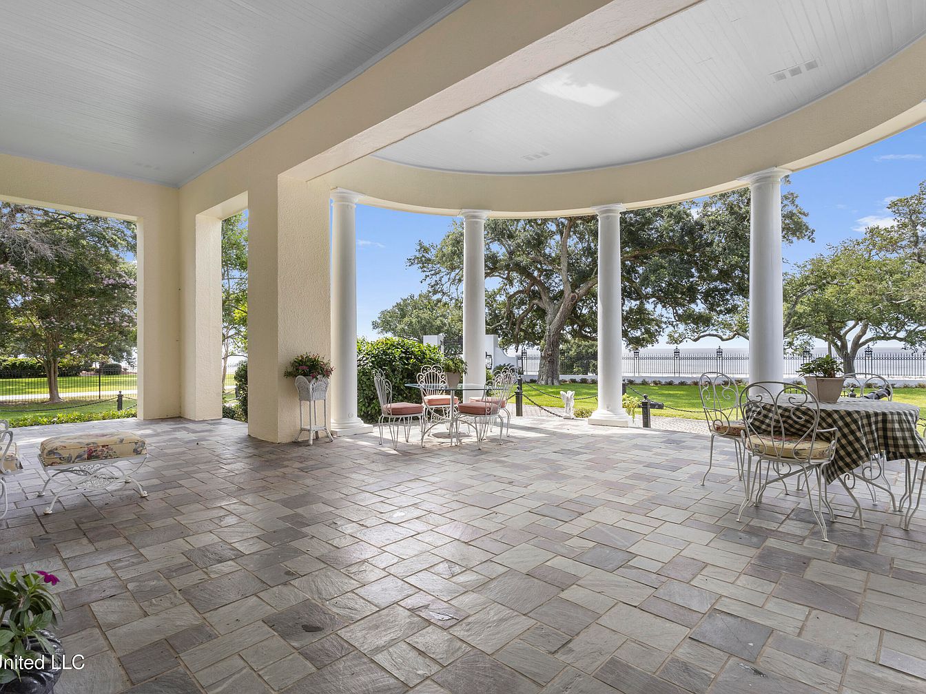 This covered patio features expansive open space defined by elegant columns and a charming stone floor. The color scheme is soft and inviting, with a light cream backdrop that complements the pale blue ceiling. Seating arrangements include delicate wrought iron furniture, with a mix of patterned cushions, creating a cozy atmosphere. A round table adorned with a checkered cloth contrasts beautifully with the surrounding greenery visible through large openings. Lush trees and manicured landscaping accentuate the serene outdoor view, inviting relaxation and casual gatherings, while the structural elegance enhances the home’s historic character.