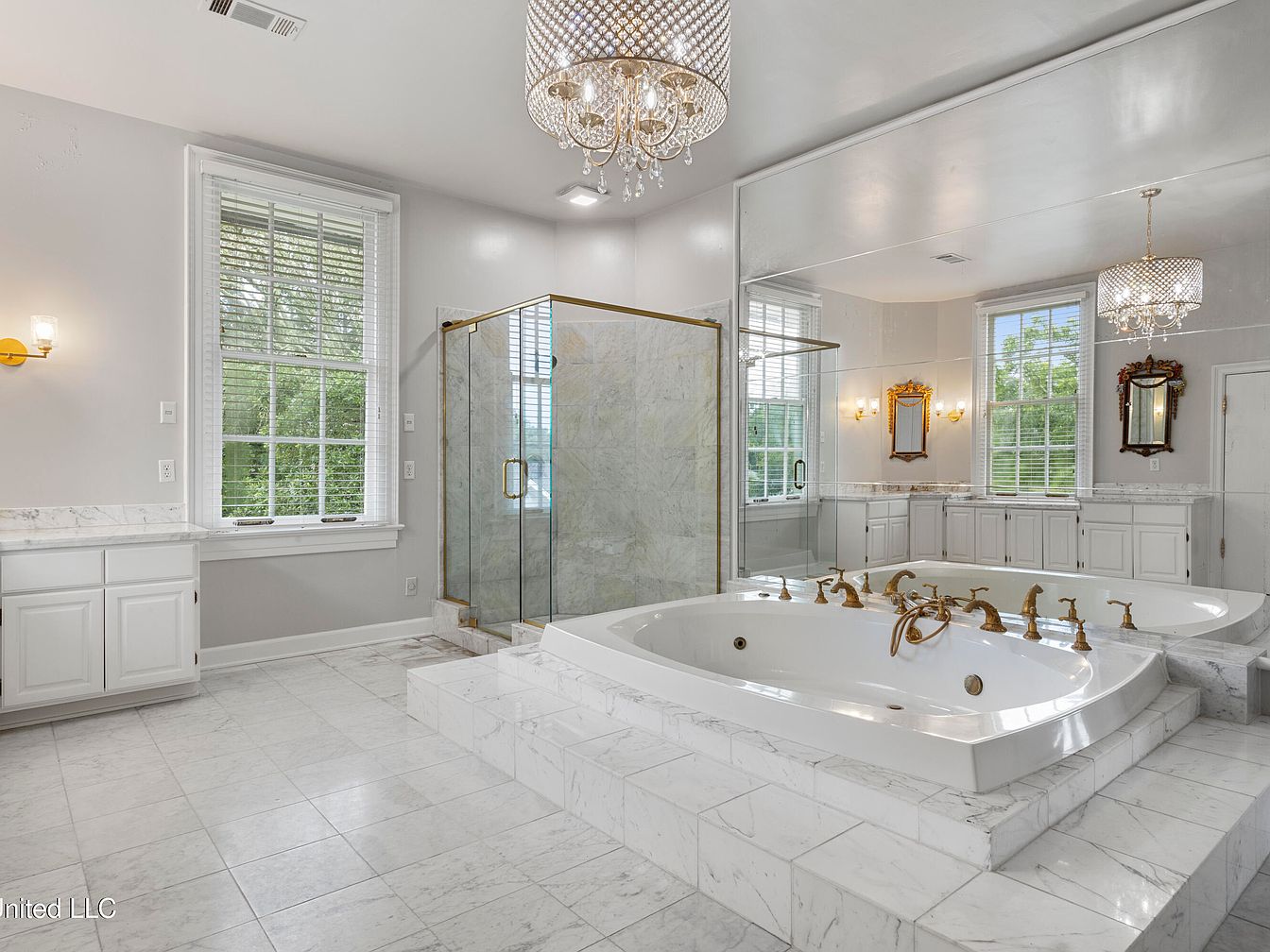 This spacious bathroom features a freestanding soaking tub elevated on marble steps, complemented by elegant gold fixtures. A glass shower enclosure stands nearby, separated by a polished marble wall. The room’s soft gray walls enhance the natural light streaming through large, divided-sash windows, adorned with white blinds. A chandelier adds a touch of glamour, while wall sconces provide warm ambient lighting. White cabinetry offers ample storage, and ornate mirrors reflect light and depth, accentuating the lavish atmosphere. The polished marble flooring ties together the sophisticated design elements, creating a serene and indulgent retreat.
