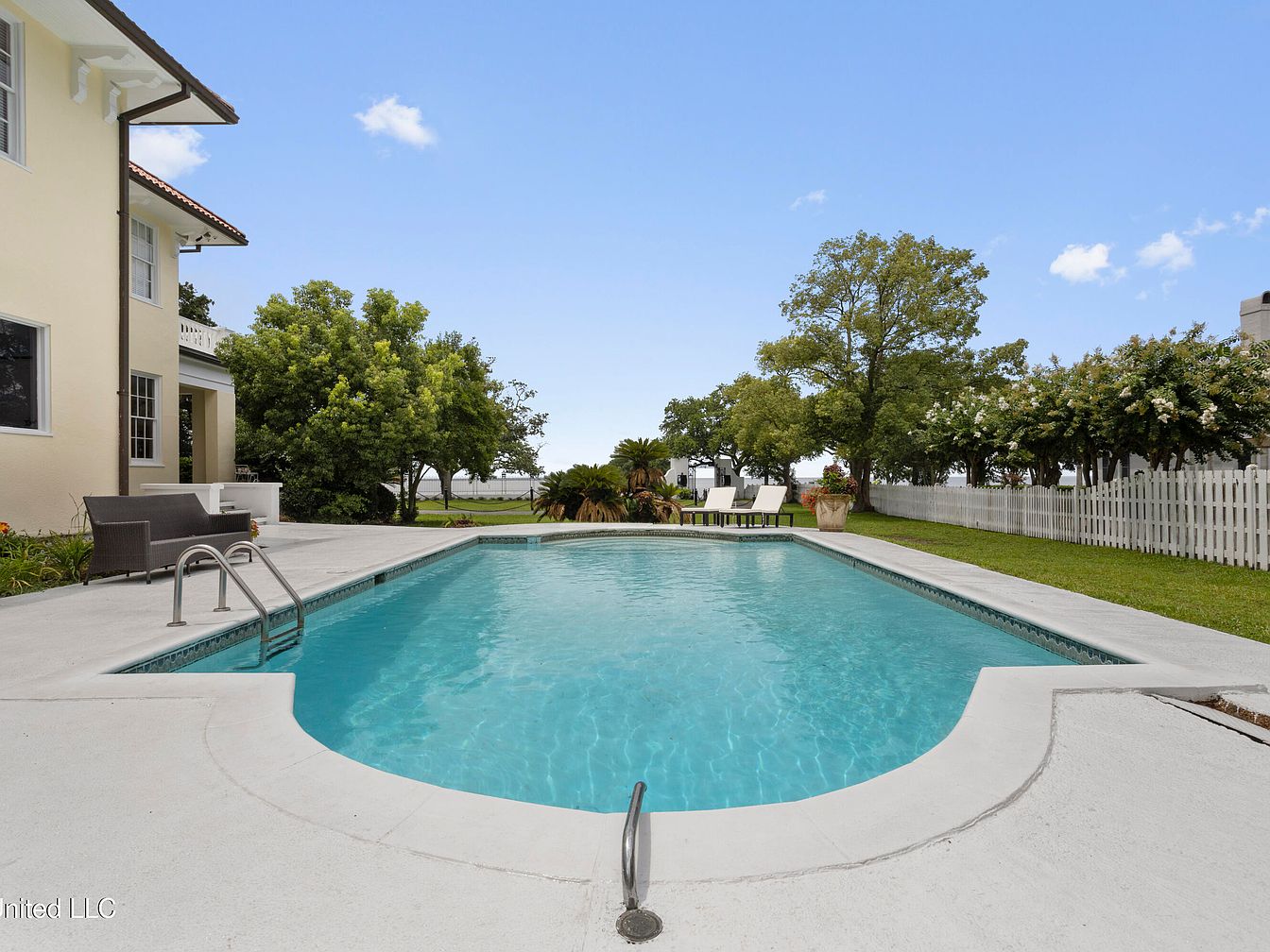 A serene pool area showcasing a crystal-clear swimming pool surrounded by a smooth, concrete patio. To the left, a brown wicker lounge chair invites relaxation, while the backyard features lush greenery and trees providing natural shade. The property is enclosed by a white picket fence that enhances the charming aesthetic. In the background, two simple white lounge chairs sit on a small grassy patch, perfect for sunbathing. The sky above is bright blue with scattered clouds, contributing to the relaxed atmosphere. This harmonious blend of outdoor space emphasizes comfort, leisure, and tranquility.