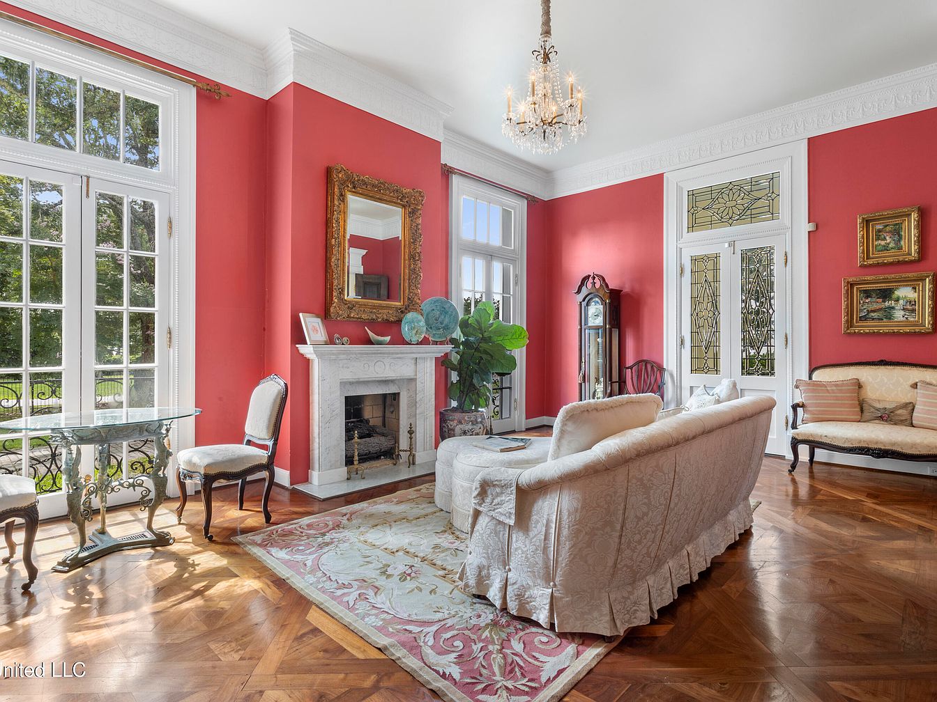 This elegant living room features vibrant red walls that enhance its historic charm. Natural light floods through large, multi-paneled windows, illuminating the intricate parquet floor design. A plush, cream-colored sofa and matching armchairs provide a comfortable gathering space, while delicate floral patterns on the area rug introduce a soft contrast. A vintage, ornate mirror hangs above the marble fireplace, flanked by tasteful artwork. Near the entrance, a glass-top table adds a contemporary touch, complemented by a tall, classic grandfather clock. The overall aesthetic blends traditional elegance with modern comfort, showcasing meticulous architectural details like crown molding.