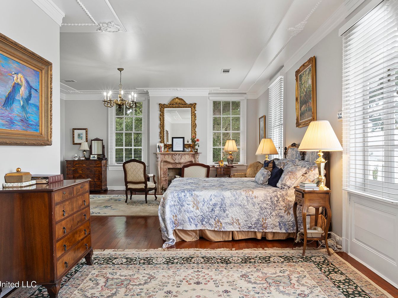 This serene and sophisticated bedroom features a classic design with a soft color palette of muted blues and warm neutrals. A large decorative chandelier hangs from the ceiling, illuminating the space alongside two elegant bedside lamps. The bed is adorned with a textured duvet and multiple pillows, creating a cozy focal point. Flanking the bed are two mahogany nightstands, each supporting reading materials. An ornate mirror and a vintage dresser with intricate woodwork add charm, while large windows with white blinds invite natural light. A decorative rug with floral patterns anchors the room, enhancing its refined aesthetic.