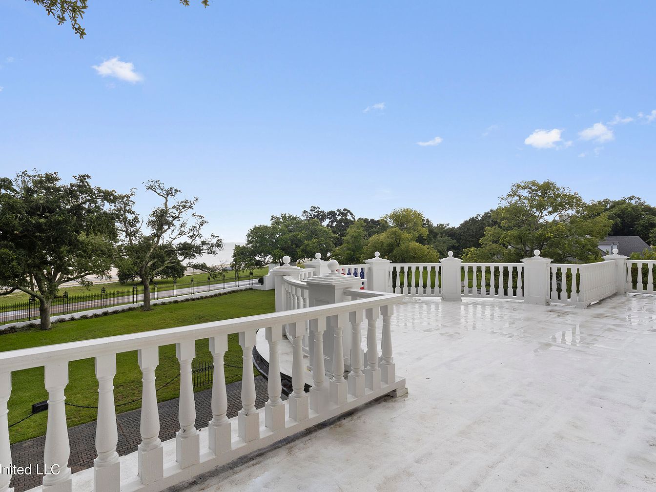 A spacious terrace showcases a pristine white railing adorned with classical balusters. The glossy surface beneath reflects the clear blue sky, enhancing the sense of openness. Lush green trees border the area, integrating nature with the terrace’s modern design. Beyond, a manicured lawn extends, leading to a road lined with a neat fence. The architectural style emphasizes elegance, complemented by clean lines and understated sophistication. This outdoor space invites gatherings and relaxation, with ample room to enjoy natural light and panoramic views, creating a serene retreat above the surrounding landscape.