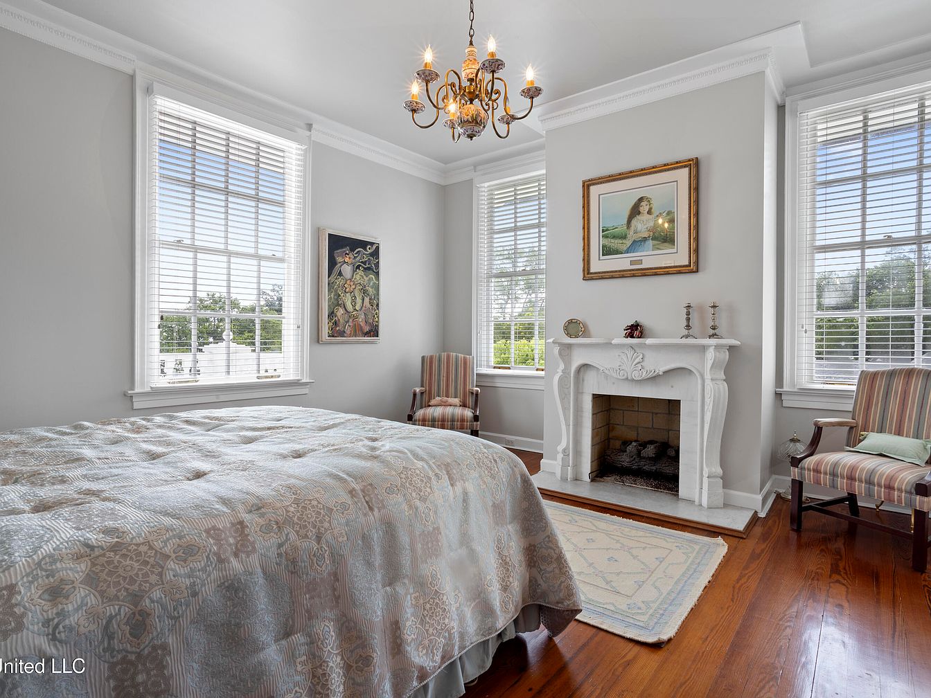 A serene bedroom features muted gray walls and plush hardwood flooring, enhancing a tranquil atmosphere. The centerpiece is a queen-sized bed adorned with a patterned quilt, exuding comfort and elegance. Natural light floods the space through large, multi-paned windows adorned with white shutters, inviting a refreshing ambiance. Two striped armchairs flank a delicate fireplace, accentuated by a white mantle with intricate carvings and decorative accents. A crystal chandelier hangs from the ceiling, adding a touch of sophistication. Art pieces strategically placed on the walls enhance the aesthetic, blending classic and contemporary styles harmoniously.
