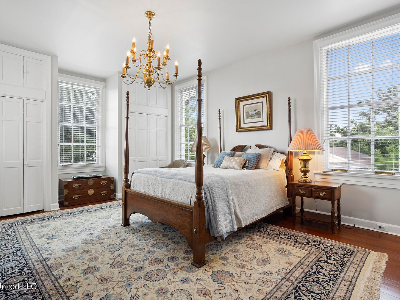 A serene bedroom featuring a stately four-poster bed against a bright, neutral wall. The room includes two large windows adorned with white blinds, allowing natural light to flood the space. A classic brass chandelier hangs elegantly from the ceiling, illuminating the room’s warm tones. A richly colored area rug with intricate patterns covers the wood floor. Flanking the bed are two charming bedside tables, each with a lamp that casts a soft glow. Decorative pillows in varying shades of blue and white add texture to the bedding, while a framed painting above the bed enhances the sophisticated ambiance.