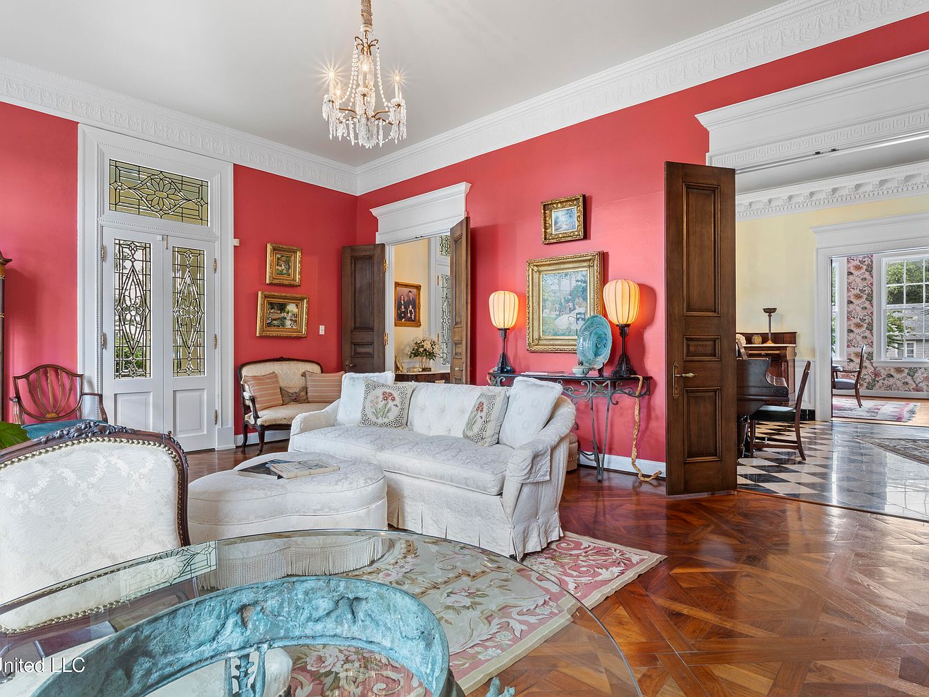 A vibrant living room showcases a striking red wall that enhances the warm, inviting atmosphere. Elegant Victorian furnishings include a plush white sofa adorned with decorative cushions and an intricate, glass-topped coffee table. A charming chandelier hangs from the ceiling, casting a soft glow. Beautiful stained glass doors offer a glimpse into the foyer, complemented by a pair of vintage lamps with soft blue and gold hues, adding a pop of color. Artwork adorns the walls, providing historical context, while rich wooden details in doors and moldings add character and sophistication to the space.
