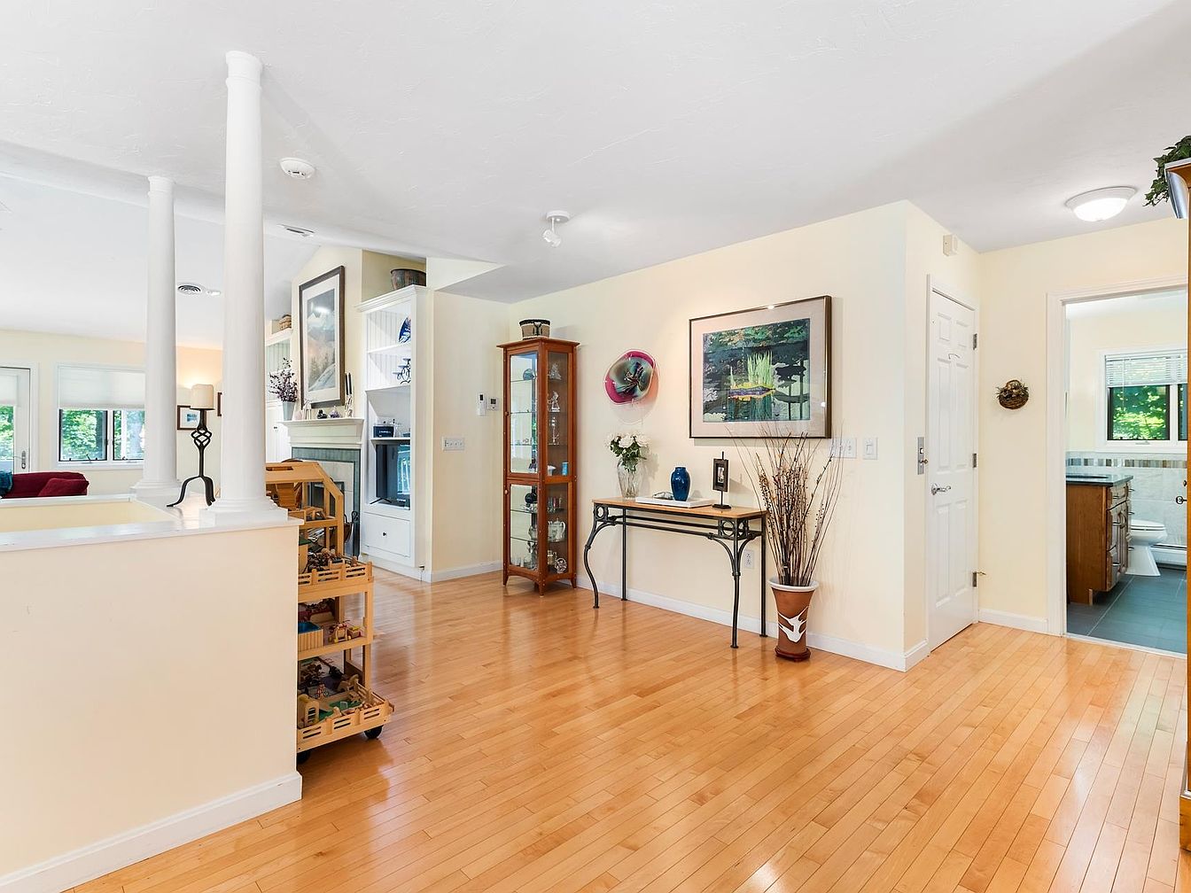 The entry hallway welcomes with warm honey-hued hardwood flooring, creating a cozy ambiance. Light, soft yellow walls enhance the brightness, complemented by white trim. Column features add architectural interest, separating spaces gracefully. A console table against the wall holds decorative items, accented by a vase of flowers. Art pieces, including a nature-themed painting, enrich the visual appeal. A glass-enclosed cabinet displays curated collectibles, adding a personal touch. To the right, a door leads to additional private areas, suggesting functional flow. Natural light spills into the room through large windows, enhancing the inviting feel.
