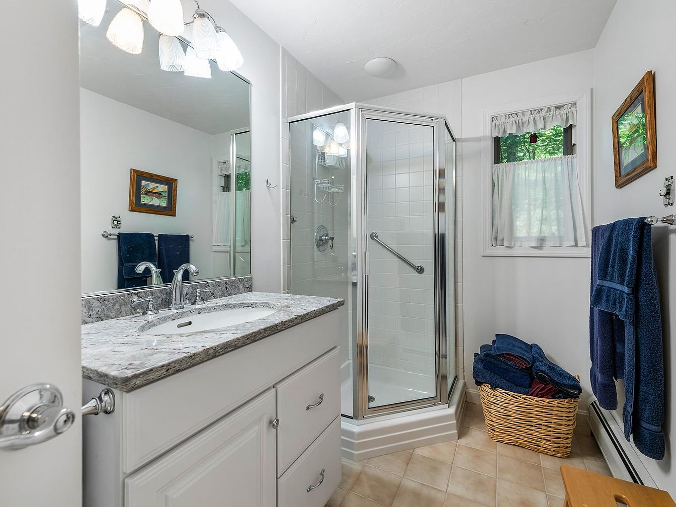 This bathroom showcases a functional and inviting layout. A spacious granite countertop with a dual sink offers ample space for daily activities. The cabinetry is painted white, complementing the clean, light color scheme of the walls. Natural light spills in through a curtained window, enhancing the airy feel. Adjacent, a glass shower enclosure stands, featuring modern fixtures and tiled walls. Soft blue towels hang neatly on a towel rack, adding a pop of color that harmonizes with the warm beige tiles. An artistic touch is present with a framed painting, creating a cozy and welcoming atmosphere.