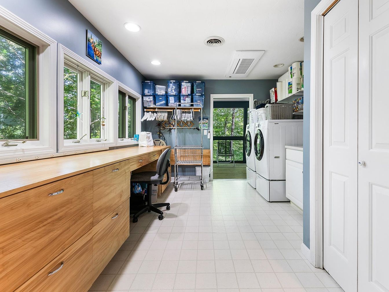 A spacious laundry room features elongated wooden countertops complemented by sleek cabinetry in warm tones. The walls are painted in a soft blue, enhancing the openness of the space. Large windows line one side, allowing natural light to illuminate the area and offering views of greenery outside. On the right, shiny white appliances, including a washer and dryer, provide modern functionality. Foldable wheels and storage baskets are neatly organized nearby, emphasizing practicality. A light-colored tiled floor adds to the room’s brightness, while a door leads to an outdoor area, integrating indoor and outdoor living.