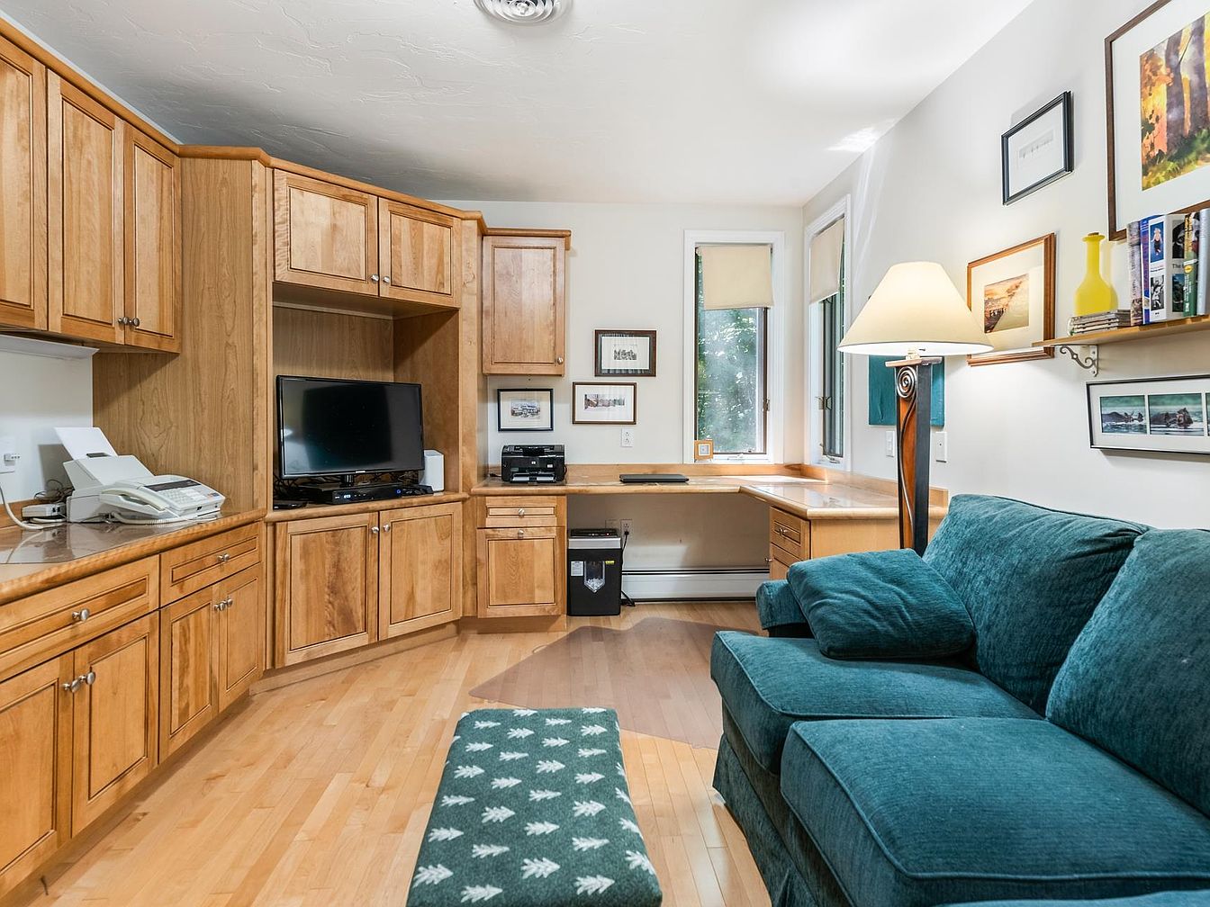 This cozy home office features rich wooden cabinetry in warm tones, complementing the seamless layout that maximizes space. A comfortable teal sectional sofa adds a pop of color and invites relaxation. Adjacent to a large window, a minimalist wooden desk is bathed in natural light, perfect for productivity. Decorative elements include framed photographs and a vibrant yellow vase on a shelf, enhancing the aesthetic. The wooden floor exudes warmth, and the integrated technology, such as a television and printer, integrates functionality with style. The overall ambiance blends comfort, practicality, and personal touches, ideal for both work and leisure.