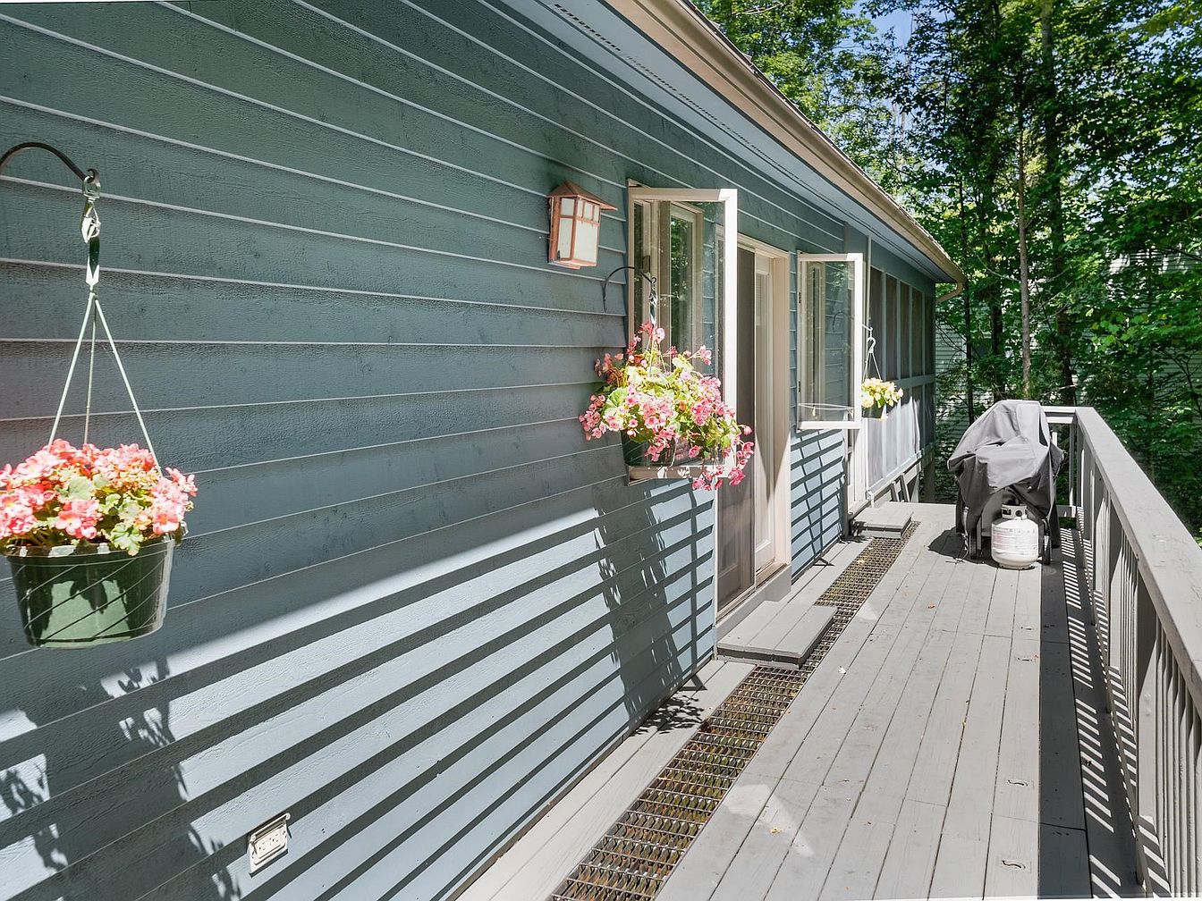 A serene deck area features a soft blue exterior siding, complemented by light taupe trim. Two windows on the building invite natural light, flanked by charming hanging flower baskets filled with vibrant pink and white blooms. The deck surface is made of smooth, grey wood, echoing the tranquil color scheme. A covered outdoor grill sits discreetly in the corner, indicating a space intended for leisure and gatherings. The design embraces nature, with lush trees providing a green backdrop, enhancing the peaceful atmosphere. Shadows cast by the railing create interesting patterns, emphasizing the depth and dimension of the space.