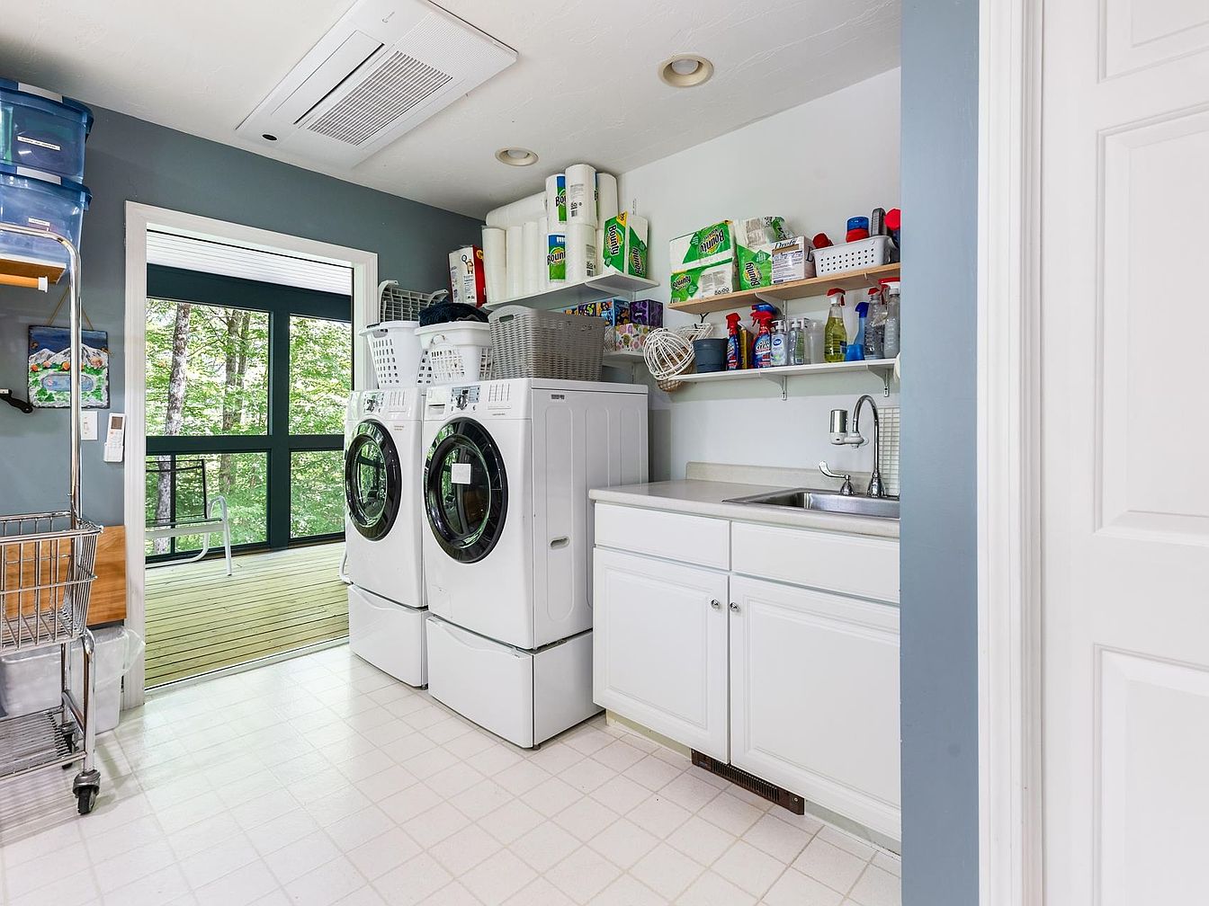 This laundry room features a practical layout with a focus on functionality. The space includes two modern front-loading washers stacked side by side, set against a soft gray wall that complements the white cabinetry below. Above, open shelving displays a variety of cleaning supplies, neatly organized in labeled containers. Natural light floods in through a large window, inviting the outdoors in and enhancing the airy feel. The floor is covered in light tile, adding to the room’s brightness. A utility sink offers additional utility, while a rolling cart in the corner adds convenience for laundry chores.