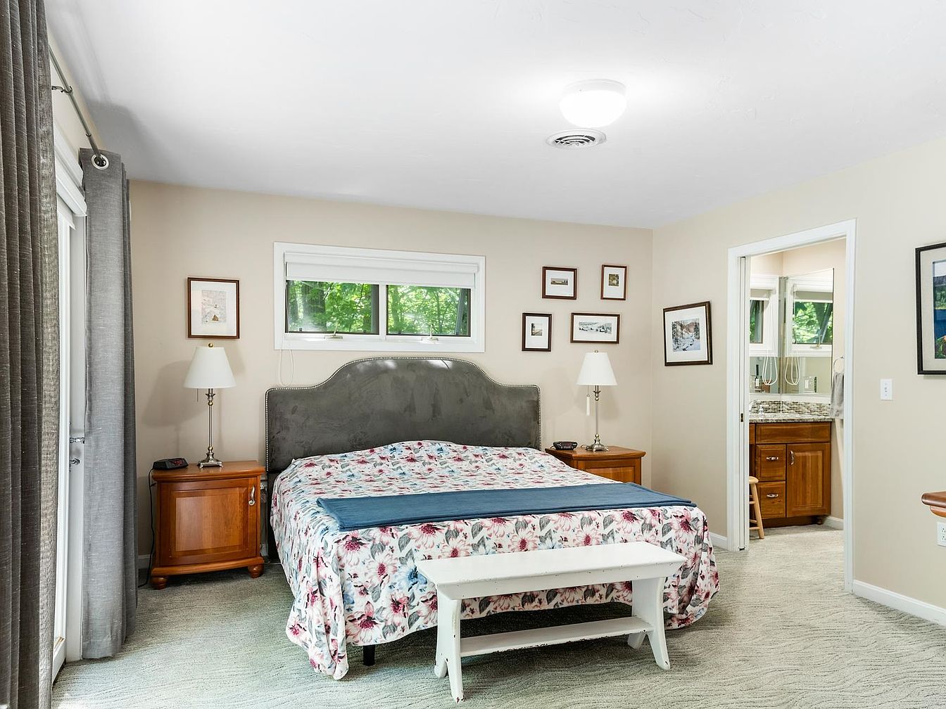 A cozy bedroom featuring a plush, upholstered headboard with a floral-patterned comforter in soft pinks and blues. Two wooden nightstands with lamps flank the bed, providing warm lighting. The walls are painted a calming beige, complemented by light gray curtains that frame the window, allowing natural sunlight to flood the room. Decorative framed photographs adorn the walls, adding personality. A small white bench sits at the foot of the bed, enhancing the inviting atmosphere. To the right, an open doorway leads to a well-lit adjacent bathroom, visible through a glass door, indicating a practical yet stylish layout.
