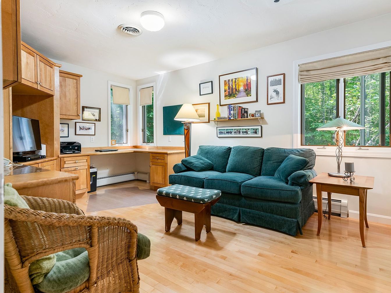 This cozy home office features a combination of functionality and comfort. A rich wooden desk utilizes corner space, providing an ideal work area beside a window, which floods the room with natural light. The walls are adorned with framed art and photographs, creating a personal touch. A deep teal couch offers extra seating, complemented by a unique footstool with patterned upholstery. Natural wood flooring adds warmth, while a rattan chair adds texture. The room’s neutral palette is accentuated by green accents in cushions, and the overhead lighting enhances the inviting atmosphere, perfect for productivity and relaxation.