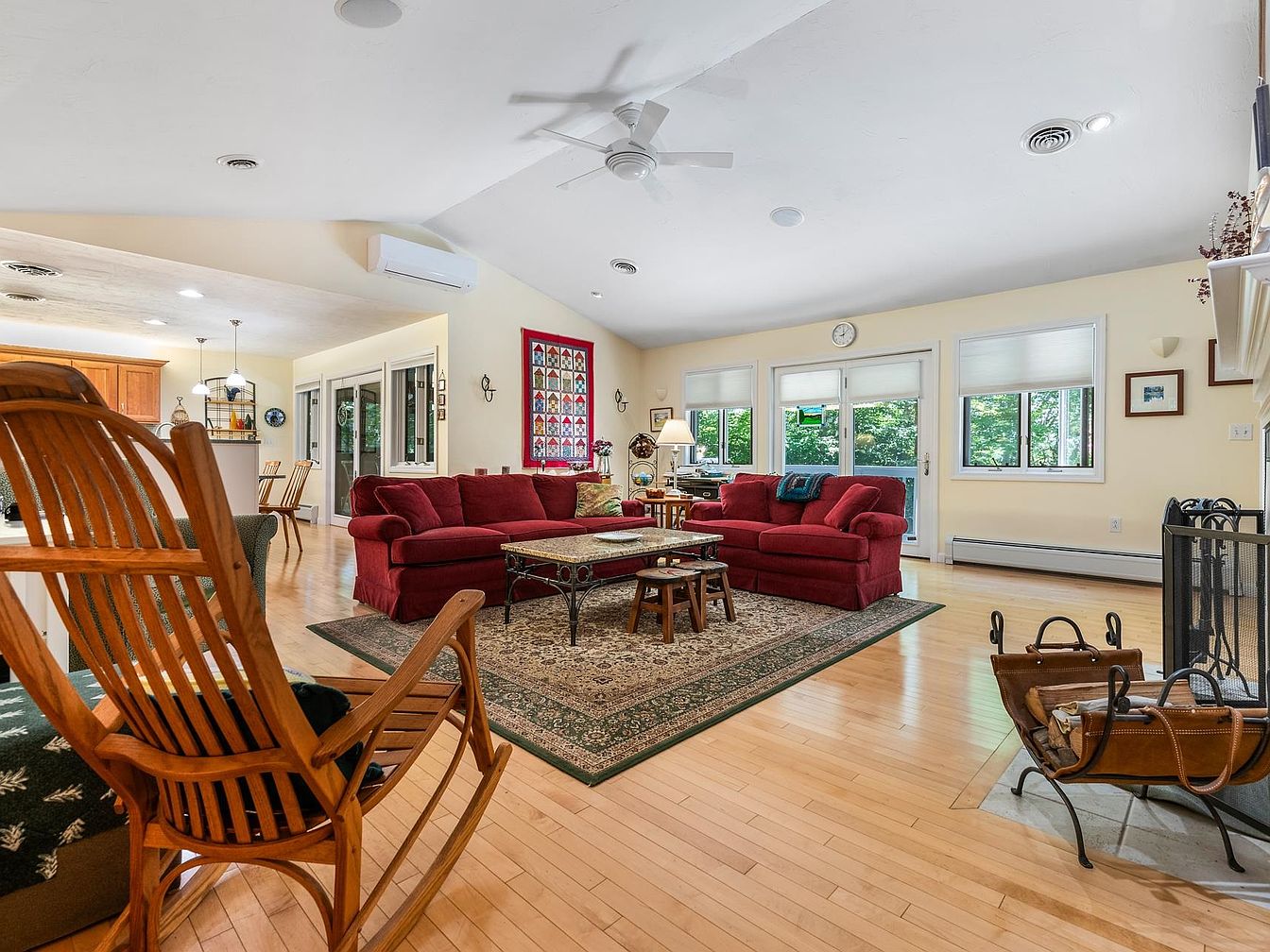 This cozy living room features a warm, inviting atmosphere with rich red sofas complemented by a decorative area rug. Natural light floods the space through large windows, highlighting the soft yellow walls. A charming coffee table sits at the center, surrounded by additional seating options. The wooden rocking chair adds a rustic touch, echoing the hardwood flooring that enhances the room’s warmth. Architectural elements include a ceiling fan and modern light fixtures, merging comfort with contemporary style. Decorative wall art and framed pictures provide personal character, while the adjacent dining area is partially visible, fostering a seamless flow.
