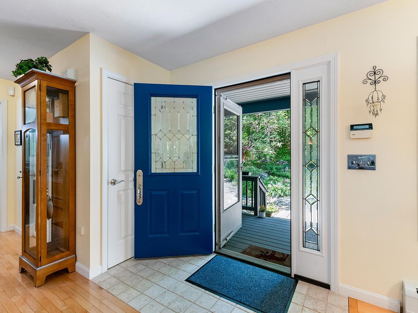 This entryway features a striking blue front door that opens to a welcoming exterior. Light cream walls enhance the openness, complemented by a blend of hardwood and tile flooring. To one side, a wooden display cabinet showcases decorative pieces, adding warmth to the space. The clear glass panels on the door and sidelights invite natural light, creating a bright atmosphere. A practical dark mat lies below the door, ensuring cleanliness. An elegant wall decoration adds a touch of character. Overall, the entryway combines functionality with inviting aesthetics, setting a pleasant tone for the home.