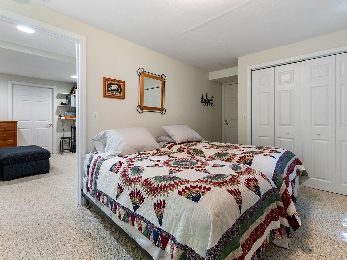This cozy bedroom features a spacious layout with two beds dressed in colorful quilts that showcase traditional patterns. The neutral walls and soft carpeting create a warm and inviting atmosphere. A decorative mirror mounted above the bed reflects light, enhancing the room’s brightness. A wooden dresser is positioned against one wall, complementing the practical design. In the background, a small desk and chair provide a workspace, while a cozy ottoman adds additional seating. Two large closets with sliding doors offer ample storage. The overall aesthetic combines comfort with functional design, ideal for relaxation.