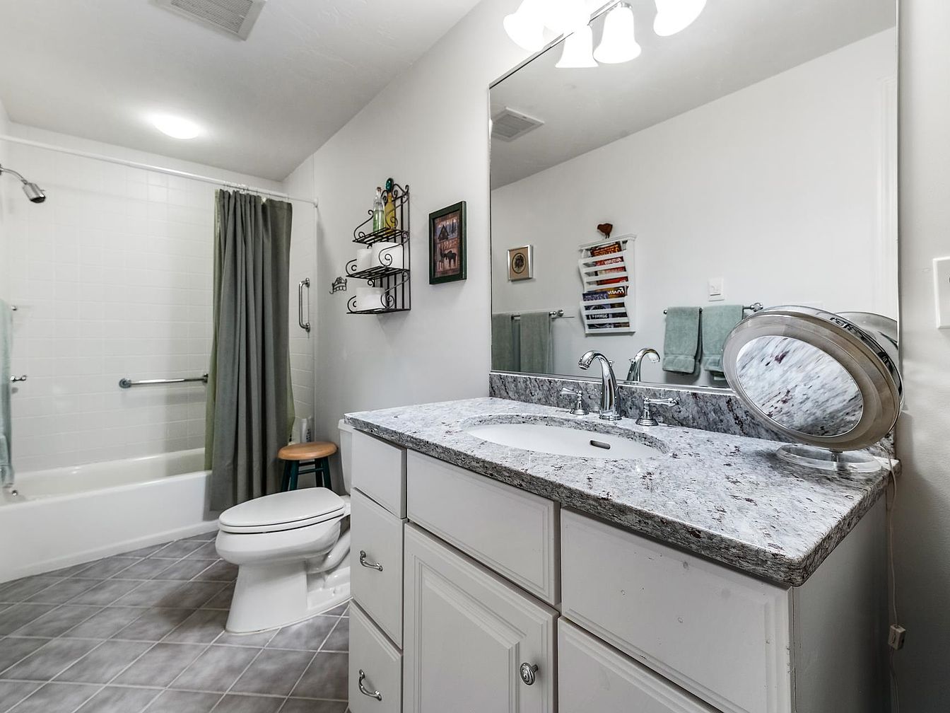 The bathroom showcases a clean, modern design with a light color palette. A spacious white bathtub is partly obscured by a soft green shower curtain, complementing the mint-colored towels hung neatly on the wall. The vanity features a sleek granite countertop in subtle gray with hints of maroon, paired with polished silver faucets. Underneath, white cabinetry offers ample storage. A large mirror reflects the illumination from three simple light fixtures above, enhancing the bright ambiance. A wooden stool provides practicality, and decorative wall elements, like a picture and a stylish rack, introduce a personal touch.