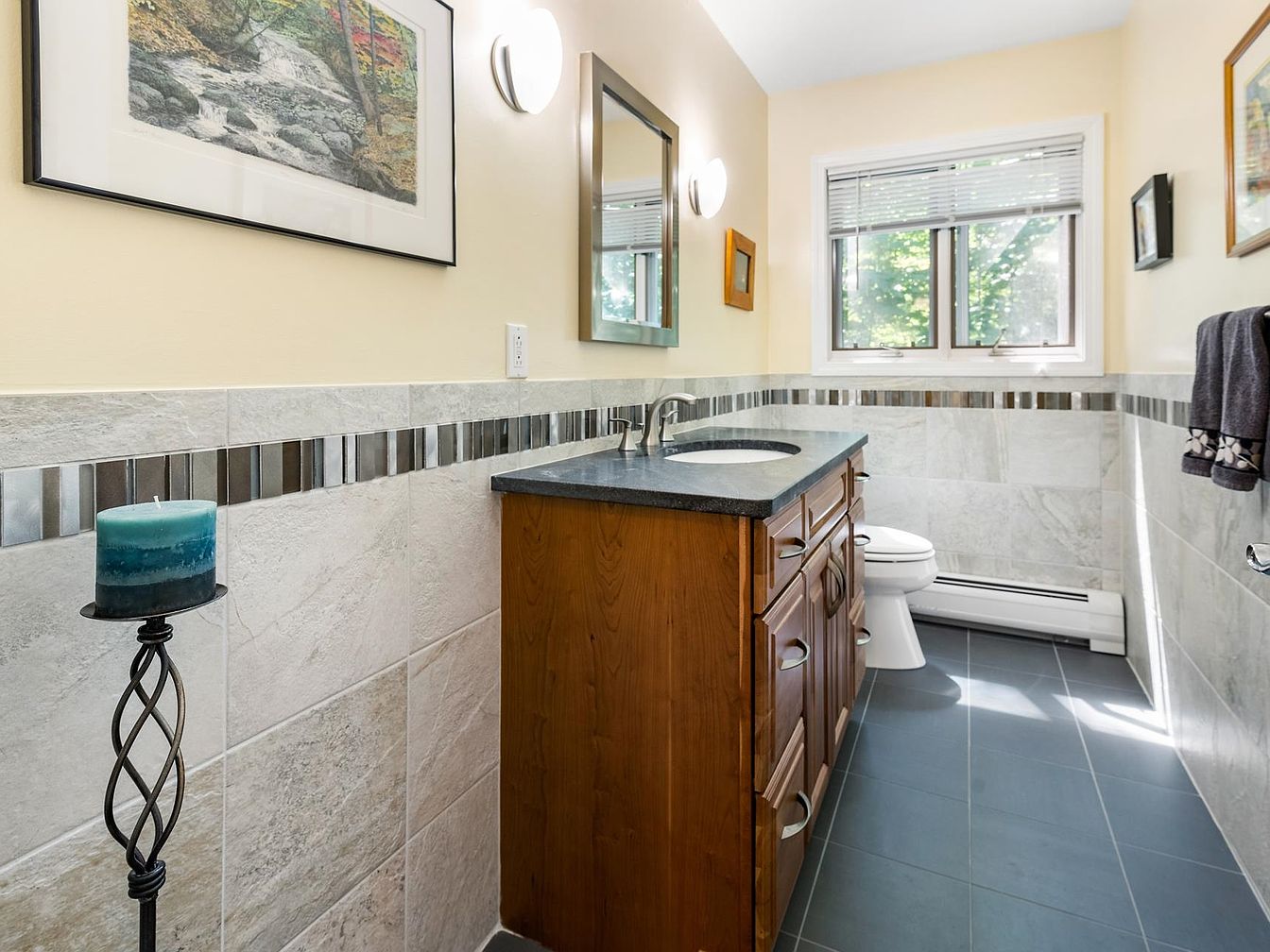 This modern bathroom features a stylish layout with natural light streaming through a window. Soft beige walls complement the minimalist design, while a sleek dark countertop contrasts beautifully against the light-colored cabinets. The peerless tilework showcases a blend of textures, with large gray tiles adorning the lower half of the walls and a decorative mosaic strip above. A mirrored vanity reflects light, enhancing the airy feel. The room includes a stylish candle on a decorative stand, adding a touch of warmth, and neatly hung towels suggest a well-organized, inviting atmosphere.
