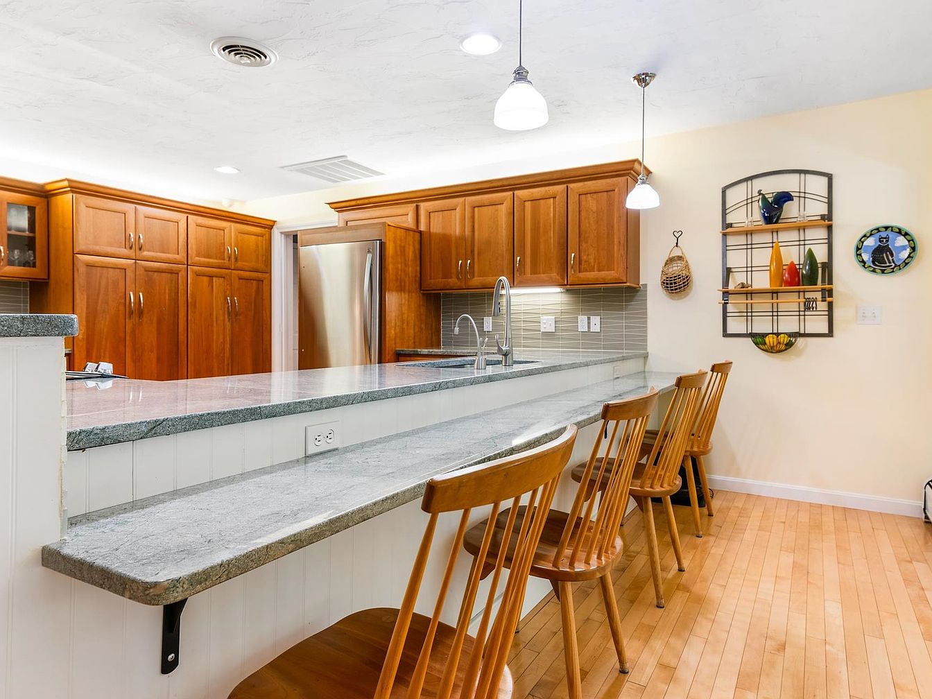 The kitchen features a contemporary design with sleek granite countertops and warm, rich wood cabinetry. A spacious island with high chairs invites casual dining, highlighted by modern pendant lighting above. The cabinetry utilizes a blend of traditional craftsmanship with stylish hardware, enhancing the warm ambiance. The layout ensures functionality, with a full-sized stainless steel refrigerator and neatly arranged backsplash tiles that add texture. The wood flooring adds warmth to the space, complementing the color palette of soft, neutral walls, and the decorative wall shelf showcases vibrant ceramics, infusing personality into the area.