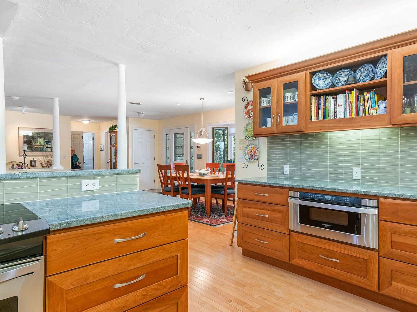 The kitchen features an open layout with a combination of natural oak cabinetry and a pale green backsplash, creating a warm and inviting atmosphere. Light hardwood floors enhance the spacious feel while complementing the rich wood tones. A granite countertop offers ample workspace, accompanied by modern appliances including a range and built-in microwave. Glass-front cabinets display decorative plates and cookbooks, adding a personal touch. A dining area is visible in the background, furnished with wooden chairs around a table, reinforcing the cozy, family-oriented essence of the home. Bright, ambient lighting casts a welcoming glow throughout.