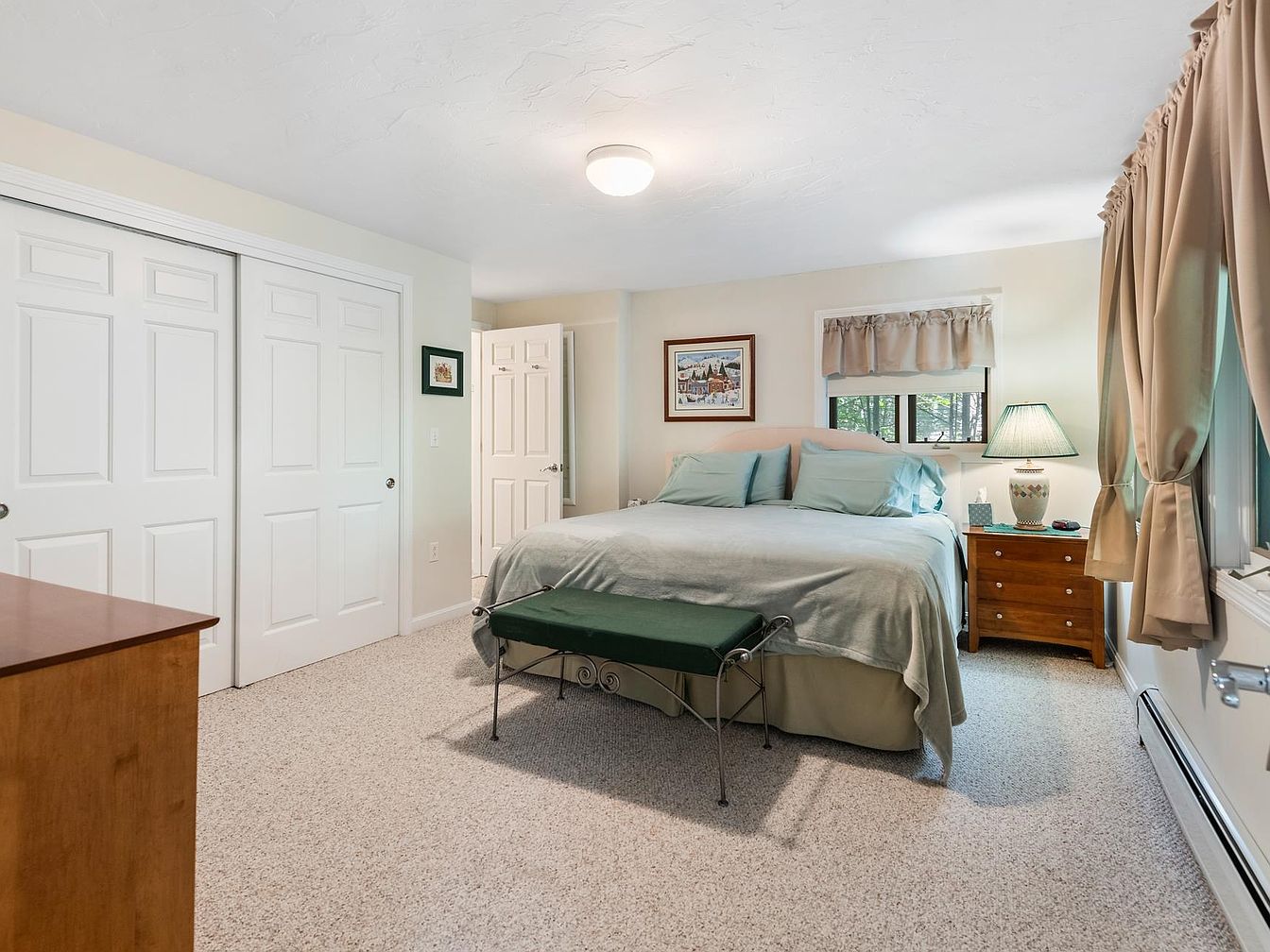 This serene bedroom features soft, neutral tones with a spacious layout. A light beige carpet covers the floor, enhancing the room’s warmth. The focal point is a comfortable bed dressed in light blue linens and accented with matching pillows. A wooden nightstand hosts a decorative lamp, providing a cozy glow. To the side, a green bench adds a pop of color and additional seating. Two sets of white closet doors create a clean, organized appearance. Natural light filters in through windows dressed with light curtains, while framed artwork adds character to the walls, completing a tranquil retreat.