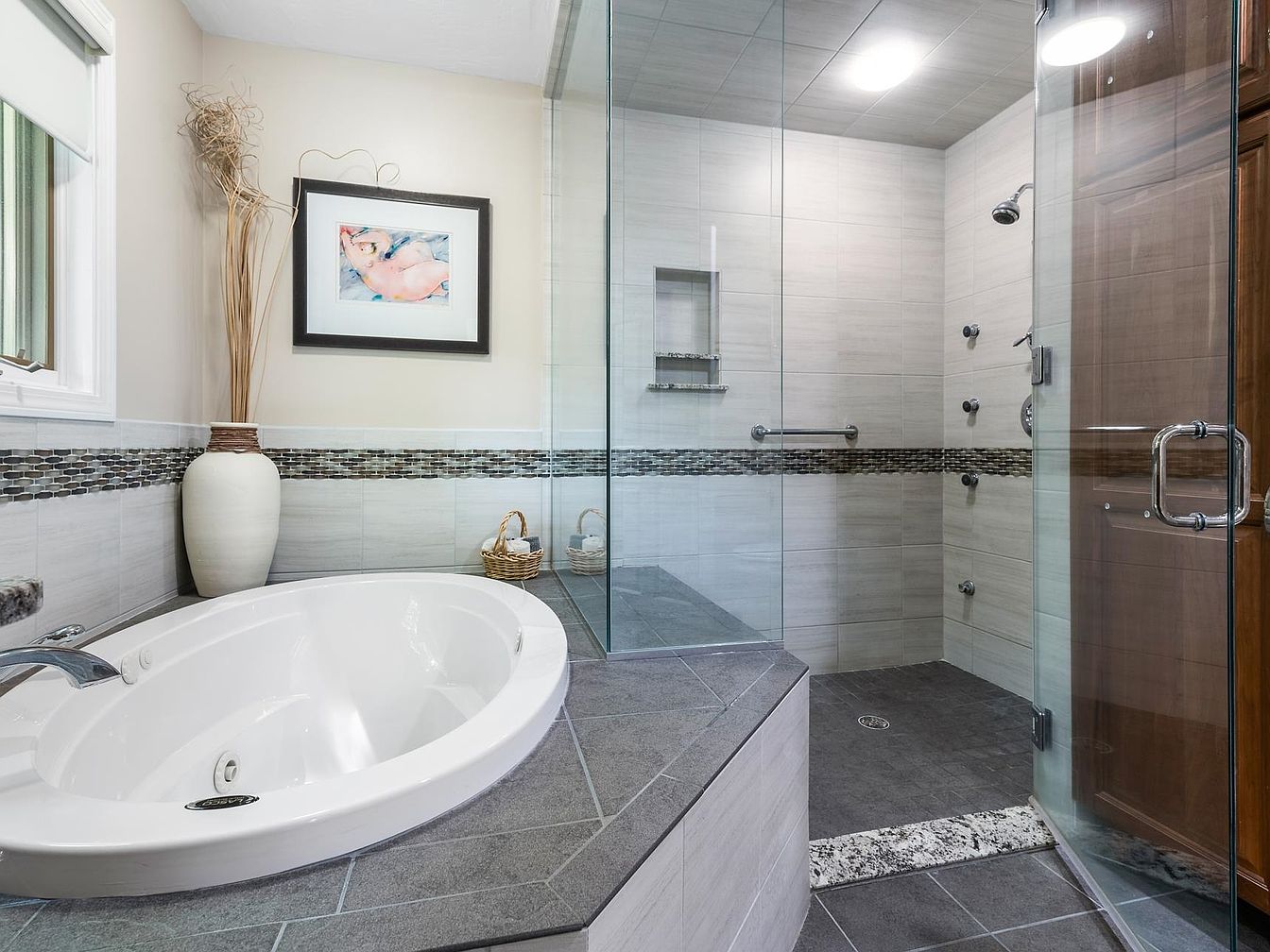 This luxurious bathroom features a spacious layout with a modern aesthetic. A freestanding white bathtub is positioned against the wall, complemented by dark gray slate flooring that adds depth. A sleek, glass-enclosed shower showcases multiple water fixtures and a decorative accent strip of mosaic tiles. Neutral beige walls enhance the brightness, while a large window invites natural light. Decorative elements include a tall vase with dried plants and a framed artwork, adding a personal touch. A wooden cabinet with rich tones offers functional storage, making this space both elegant and inviting.