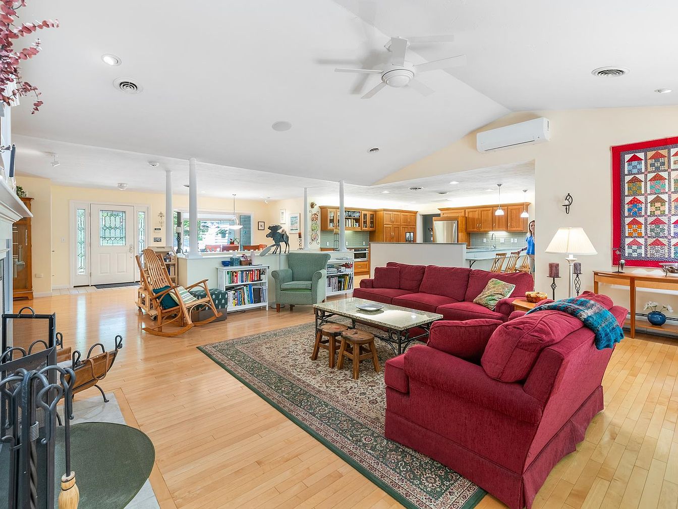 This spacious living room features an open layout that seamlessly connects to the kitchen area, fostering a warm, inviting atmosphere. Soft, natural light floods the space through large windows and a glass door, enhancing the pale yellow walls. A plush, burgundy sectional sofa provides comfort, adorned with colorful throw pillows. A central glass coffee table sits on an intricate area rug, adding a cozy touch. Adjacent, a rocking chair invites relaxation. Light wood flooring and white pillars contribute to a casual, airy feel, while a decorative quilt on the wall adds a personalized touch, reflecting homey charm.