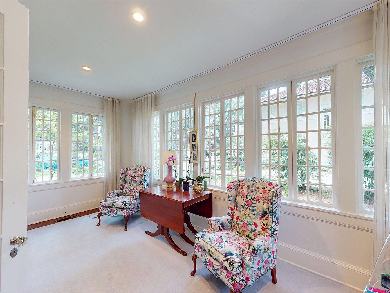 This sunroom features an abundance of natural light filtering through multiple large windows with small panes, accentuating the airy atmosphere. A soft, neutral carpet complements the subtle cream walls, while two upholstered armchairs in vibrant floral patterns add a lively touch. A wooden desk, polished and elegantly designed, sits beside a potted orchid, enhancing the space’s charm. Light sheer curtains frame the windows, softening the sunlight’s entry. The room’s architectural details highlight a blend of classic elegance and comfort, making it an inviting area for relaxation or study. Overall, it radiates warmth and tranquility.
